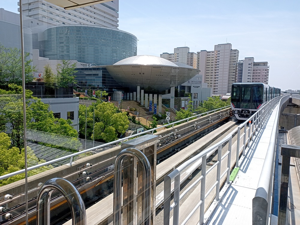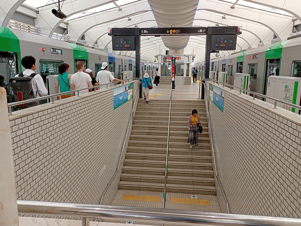 Von der Endstation Nakanoshima aus gehen wir vorbei an der Westspitze der Insel zur Station Awaza der Ōsaka Metro Chūō Line, der „EXPO-Linie“ der Metro, und fahren (erneut) in Richtung Yumeshima.