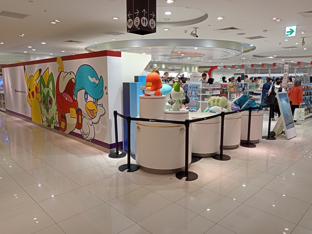 Ich bin zwar sonst kein Freund von Souvenirs oder Merchandise-Produkten, aber eine Sache musste dann doch sein: Was wäre Japan ohne Pokémon? Immerhin bin ich seit der 4. Generation (also seit ca. 2009) dabei und die Spiele begleiteten mich und meine Schulkameraden durch unsere gemeinsame Laufbahn am Gymnasium (und teilweise bis heute noch). In Japan gibt es dafür eine direkt vom Hersteller Nintendo betriebene Kette an „Fachgeschäften“ mit der passenden Bezeichnung „Pokémon-Center“. Tatsächlich handelt es sich dabei um einfache Souvenir-Läden, die im Design nicht den Pokémon-Centern aus den Spielen nachempfunden sind. Das tut der Fan-Freude beim Besuch aber keinen Abbruch. Das Pokémon-Center Ōsaka befindet sich passenderweise im Daimaru Department Store direkt im Bahnhofsgebäude des Hauptbahnhofs. Vom südlichen Ende des öffentlichen Bereichs der Brücke über die Bahnsteiggleise (also dem Bereich außerhalb der Sperren) führt ein Aufzug direkt in das Kaufhaus. Das Pokémon-Center liegt dort im 13. Stock.