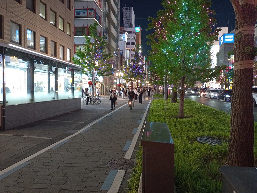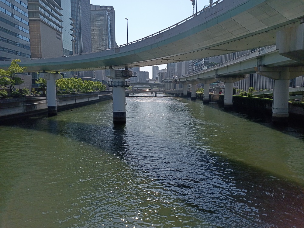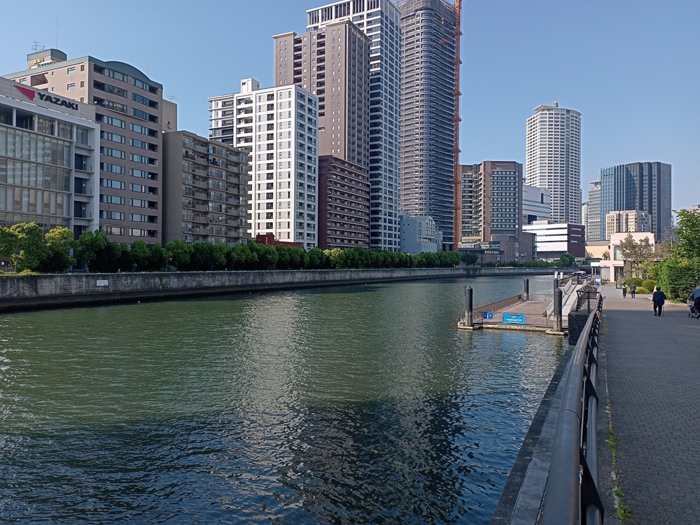 Nachdem dieser Pflicht-Programmpunkt erledigt ist, kehren wir zum ÖPNV zurück. Das ist allerdings leichter gesagt als getan: Vor den Aufzügen warten schon einige andere Kunden, manche von ihnen sitzend auf einer Wartebank. Kann ich das zunächst nicht verstehen, wird das Problem bei der Ankunft des nächsten Aufzuges nach unten sichtbar. Da die Aufzüge die Talfahrt im 15. Stock beginnen, sind sie im 13. Stock bereits so voll, dass niemand mehr zusteigen kann. Nur zwei von drei Aufzügen fahren überhaupt die Zwischenstockwerke an; der dritte fährt immer direkt vom Bahnhof in den 15. Stock und zurück. Eine Viertelstunde warten wir also vergeblich, bevor wir, wie einige der anderen wartenden auch, uns zur Rolltreppe begeben. Langsam und gemütlich, Stock für Stock, fahren wir so dem Boden entgegen und können dabei die schiere Größe eines japanischen Großkaufhauses bewundern. Endlich wieder auf der Straße angekommen, bringe ich schnell meine Einkäufe ins Hotel und wir gehen einige Schritte bis zur Insel Nakanoshima.