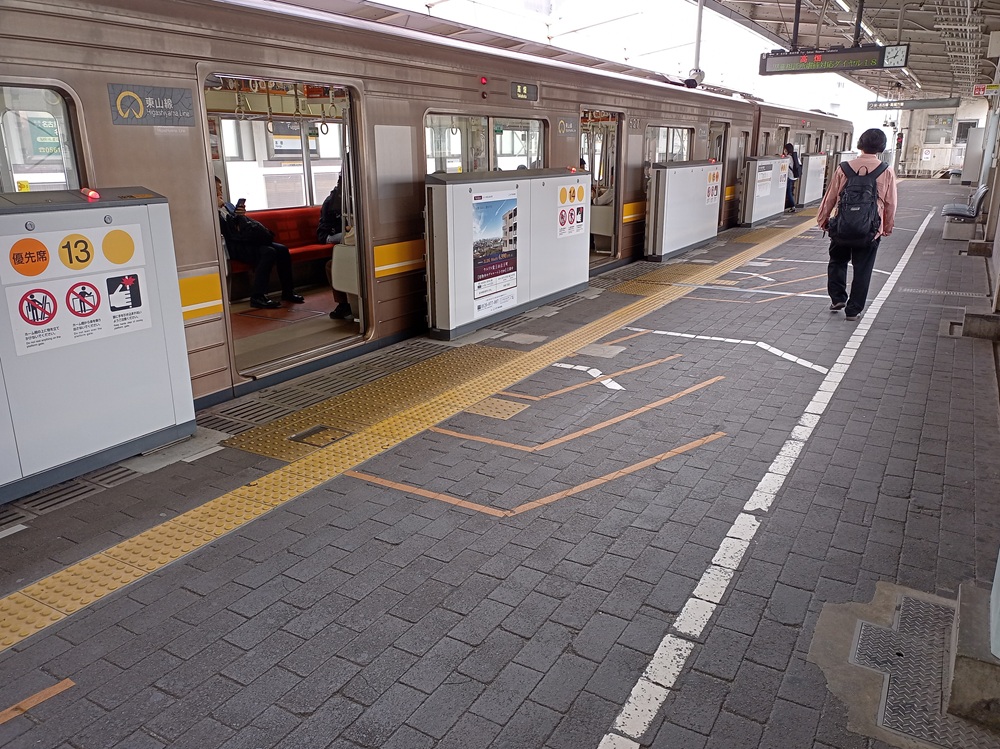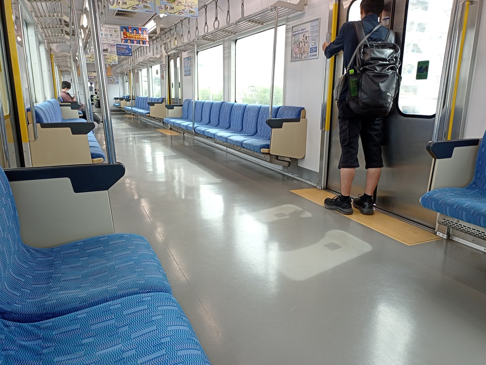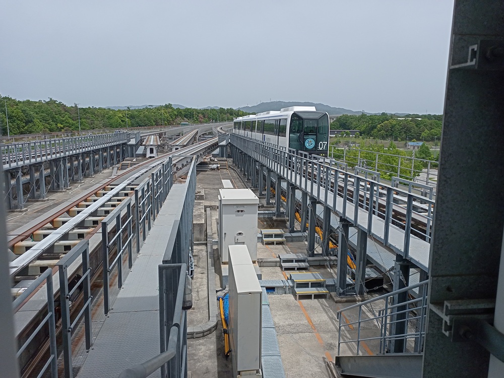Die Aichi Loop Line verkehrt in keinem festen Takt. Es fahren zur Nebenverkehrszeit rund 3 – 4 Züge pro Stunde. Leider haben wir den letzten Zug ab Shinseto (planmäßig) gerade verpasst und befinden uns nun ausgerechnet in der größten Taktlücke des Tages mit rund 25 Minuten Wartezeit. Um 10:45 fährt dann endlich der nächste Zug in Richtung Okazaki, den wir nach 10 Minuten am Haltepunkt Yakusa verlassen. Dort steht ein letzter Umstieg an, bevor wir unser erstes Tagesziel, das EXPO-Gelände von 2005, erreichen werden.
