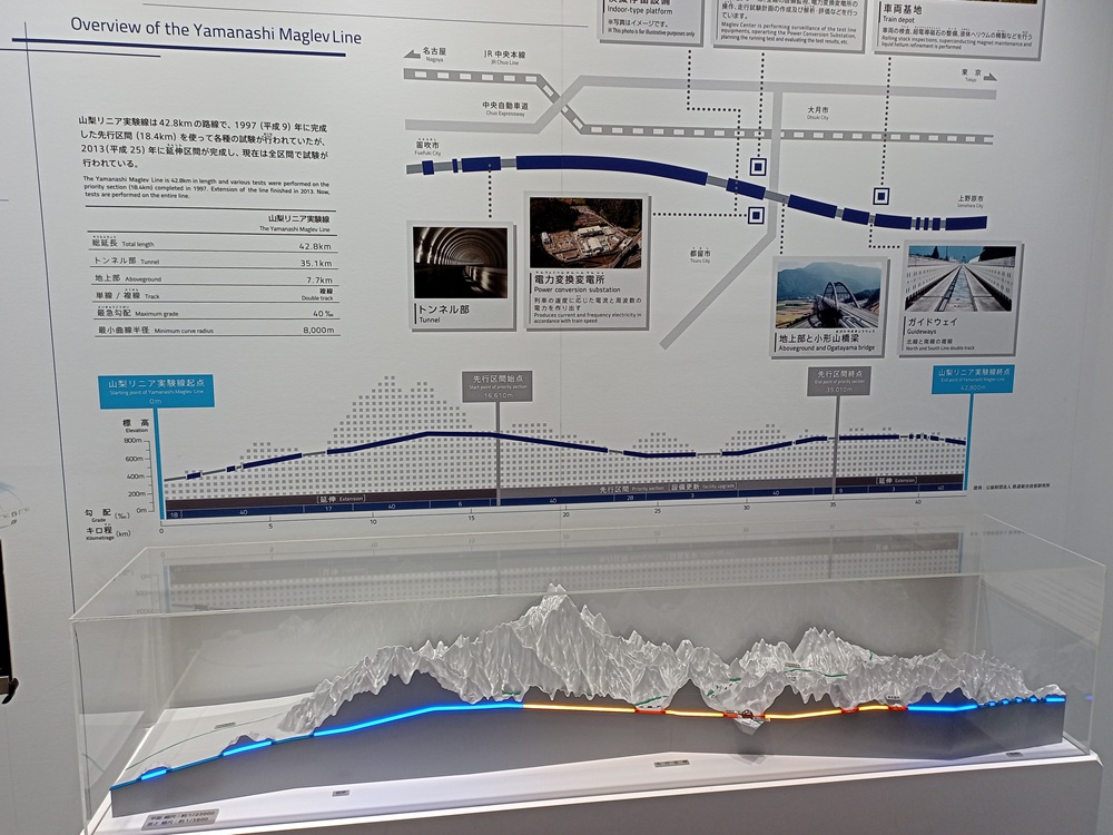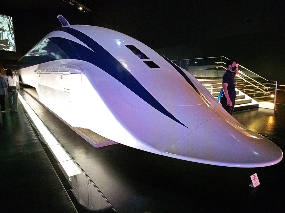 Schließlich kommen wir nun in den Raum, der dem „Superconducting Maglev“ (damit erklärt sich auch das „SC“ im Namen des Museums) gewidmet ist. Japan hat diese Technologie der supraleitenden Magnetschwebebahn in den letzten Jahrzehnten entwickelt, um eine neue Hauptstrecke im Fernverkehr von Tōkyō nach Ōsaka zu bauen, die bisherige Shinkansen-Reisezeiten von rund 2,5 Stunden in den Schatten stellen soll. Notwendig ist diese Kapazitätserweiterung auf dem wichtigen Korridor zwischen den beiden größten Städten des Landes allemal, da der Tōkaidō Shinkansen schon seit Jahren an der Belastungsgrenze betrieben wird.