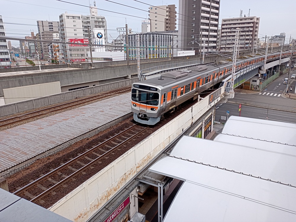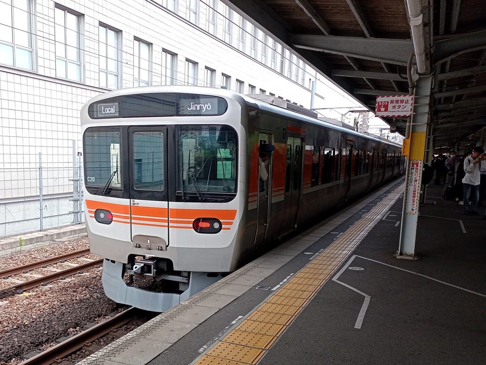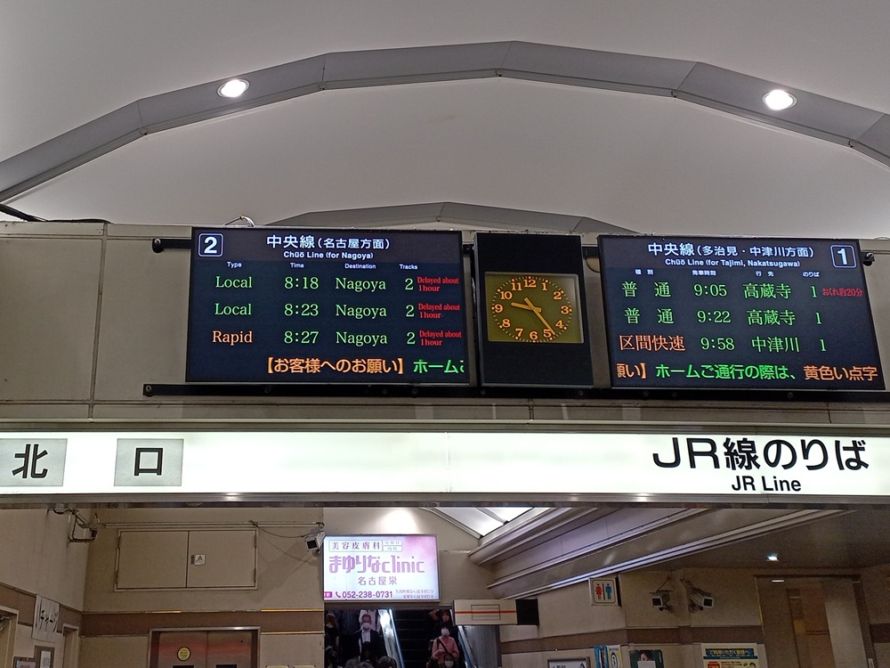 Kurz nach 9:00 erreicht der Kodama 708 den Hauptbahnhof von Nagoya und es steht, wie bereits am Vortag, ein Übergang zu den Kapspur-Gleisen an. Innerhalb der Stadt erfolgt die Weiterreise für einige Stationen auf der Chūō Main Line, einer über 400 Kilometer langen Inlandsstrecke durch die japanischen Alpen nach Tōkyō. Gemäß Fahrplan würde der nächste Nahverkehrszug der Chūō Main Line erst gegen 9:16 fahren. An der Abfahrtsanzeige in der Unterführung wird an diesem Morgen aber deutlich: Heute stimmt etwas nicht! Um 9:05 sind noch Züge mit planmäßigen Abfahrtszeiten vor 9:00 angeschrieben. Schnell gehen wir hoch zum Bahnsteig und tatsächlich steht dort ein sehr leerer Zug, der sogleich abgefertigt wird und losfährt.