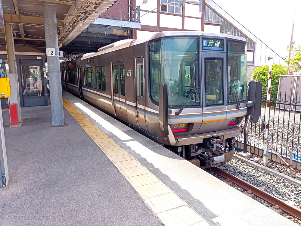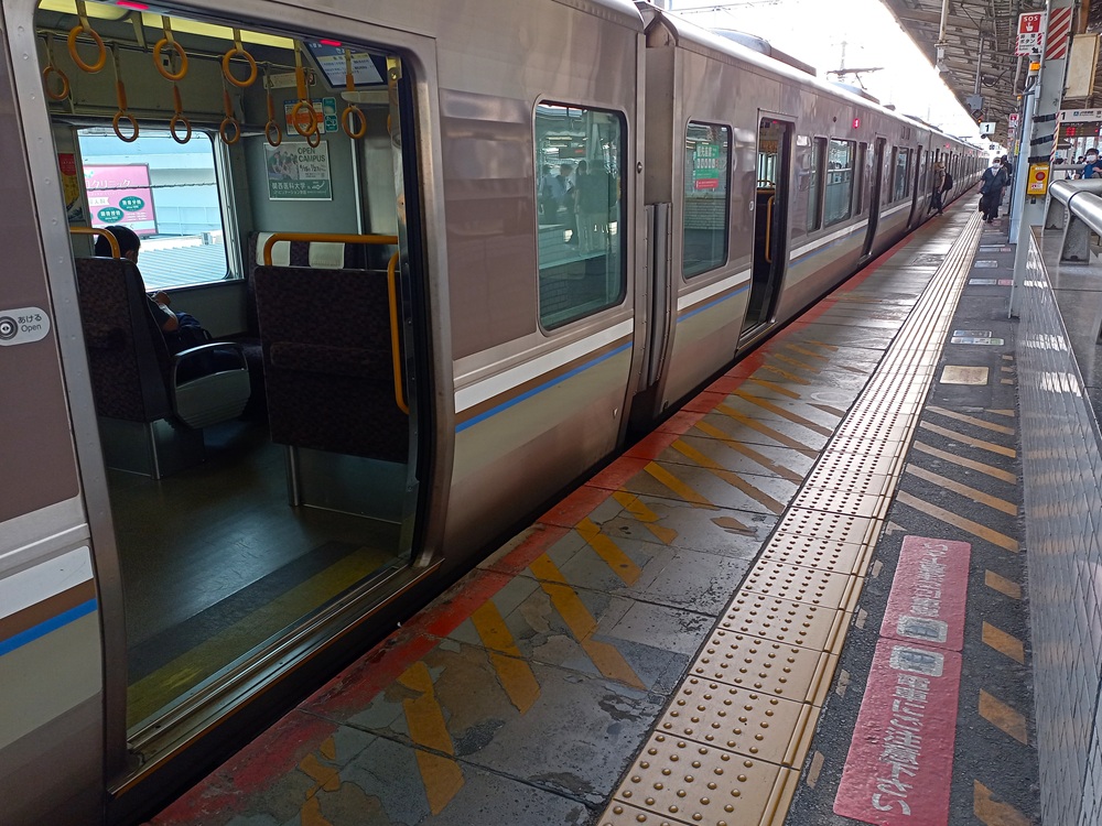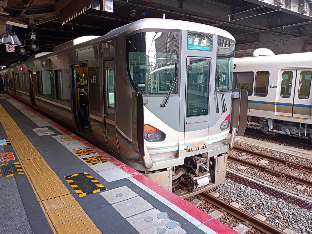 Bild 9-56: Am JR-Bahnsteig steht gleich ein Nahverkehrszug der Kosei Line nach Kyōto zur Abfahrt bereit.