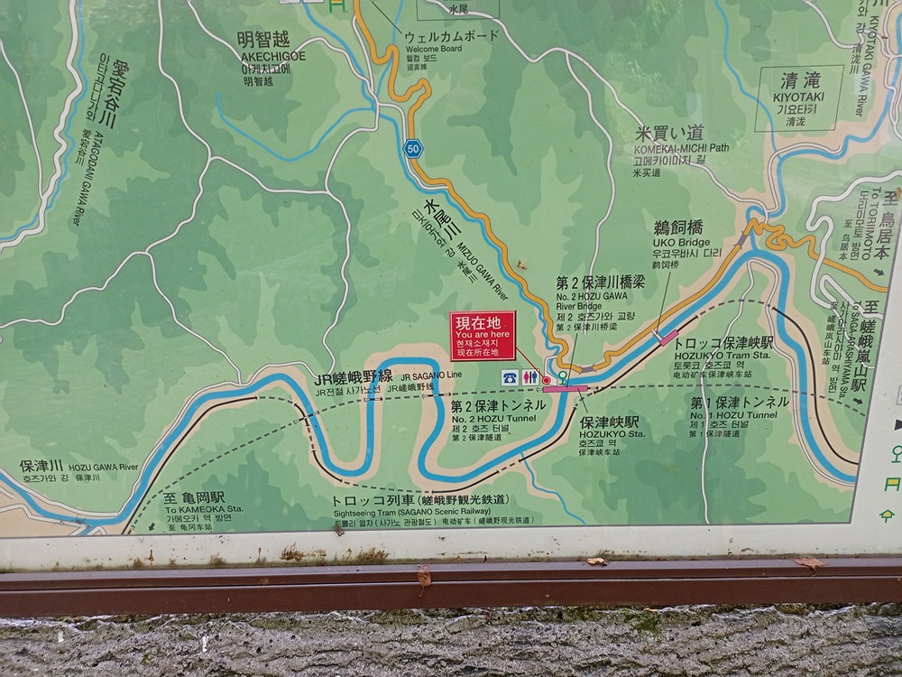 Der heutige Haltepunkt Hozukyō liegt an einer Neubaustrecke aus dem Jahr 1989, die zur Beschleunigung und zum Ausbau der historischen San’in Main Line errichtet wurde. In Bild 9-11 ist die vergleichsweise gerade, tunnelreiche Neubaustrecke („JR SAGANO Line“) gut zu erkennen. Der historische Streckenverlauf mit flussnaher Trassierung ist hier als „Sightseeing Tram“ eingezeichnet. Dazu kommen wir gleich noch 😉 Jedenfalls war die Altstrecke bis 1989 eingleisig, langsam und nicht elektrifiziert. Durch die Neubaustrecke verkürzte sich die Streckenlänge von Saga-Arashiyama nach Kameoka um rund 2 Kilometer. Eine durchgehend elektrische zweigleisige Führung wurde möglich und die Reisezeiten konnten um bis zu 15 Minuten reduziert werden, da Züge fortan mit 130 km/h auf der neuen Strecke durchfahren können. Ein Rapid von Saga-Arashiyama nach Kameoka am anderen Ende der Schlucht braucht heute für die 10 Kilometer lange Strecke nur 7 Minuten.