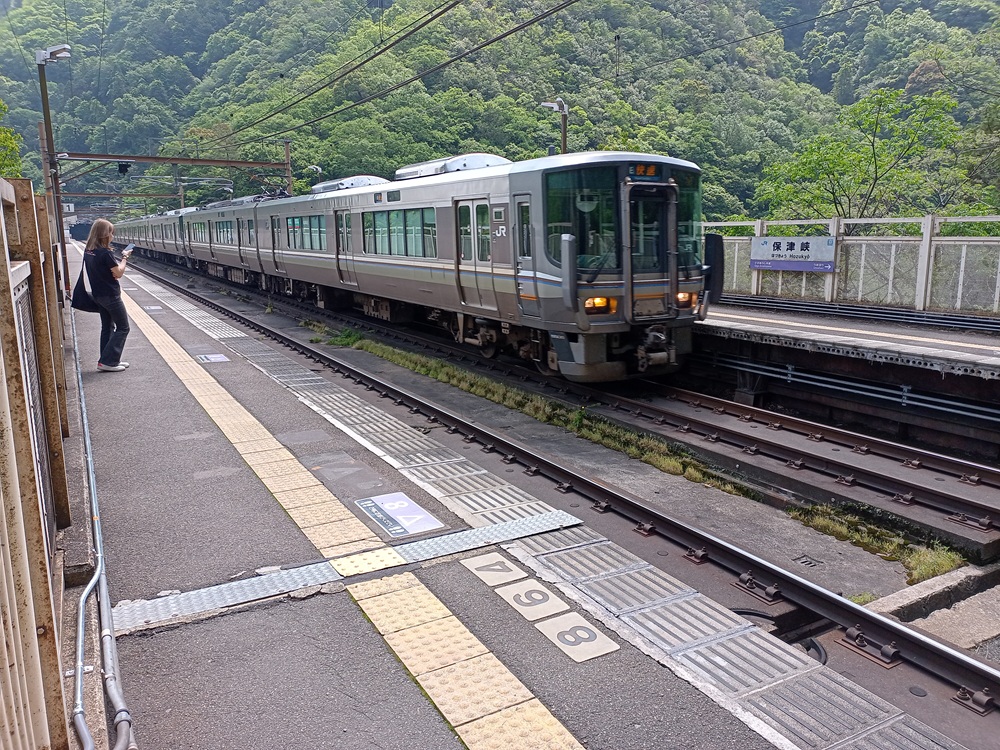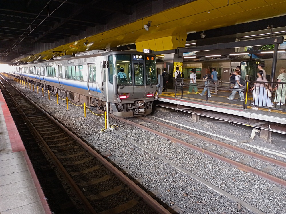 Bild 9-12: Züge am Haltepunkt Hozukyō: Zunächst ein Rapid der Baureihe 223…