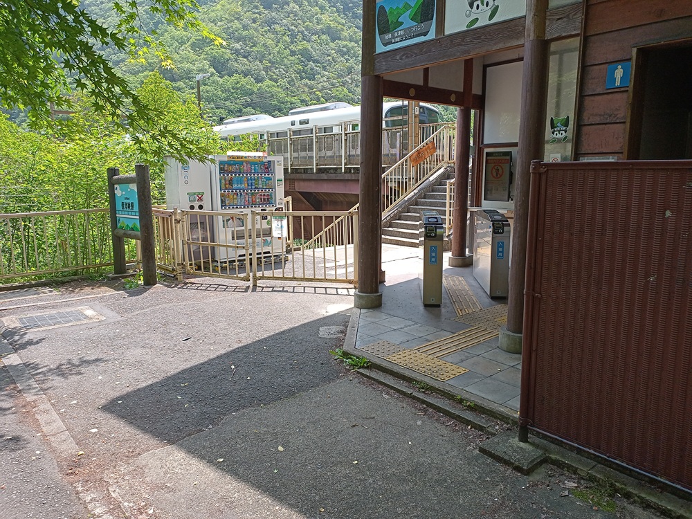 Bild 9-14: Hozukyō ist eine „unstaffed station“, also eine Station ohne örtliches Personal. Das bedeutet, hier wäre niemand in der Lage, Fahrgästen bei Problemen mit den Bahnsteigsperren zu helfen. Die Sperren sind deshalb immer offen – Fahrgäste sollten dennoch ihren Fahrschein an der Sperre validieren bzw. mit der IC-Card einchecken, da es sonst zu Problemen beim Verlassen des Zielbahnhofs kommt. Ankommende Fahrgäste geben ihren Fahrschein in einer Sammelbox ab (die im Bild durch den Zaun rechts vor der Herrentoilette verdeckt wird).