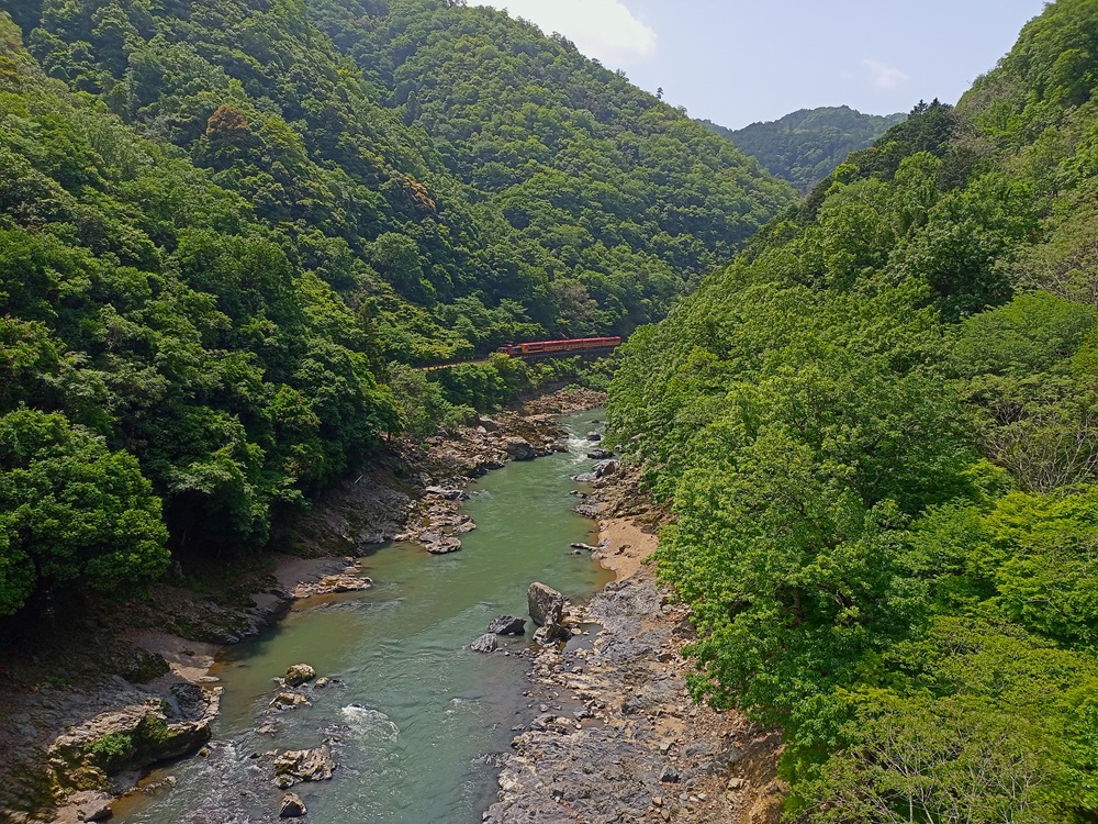 Bild 9-15: Das eigentlich sehenswerte am Haltepunkt Hozukyō ist die Aussicht vom Bahnsteig auf die Schlucht – hier talwärts in Richtung Arashiyama…
