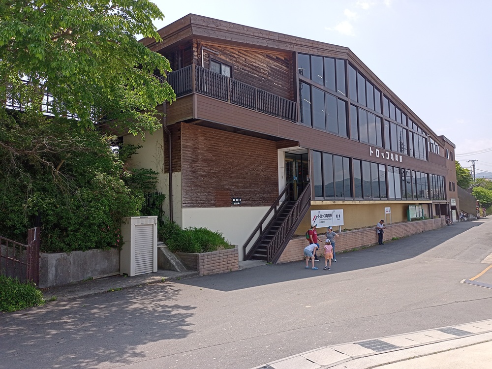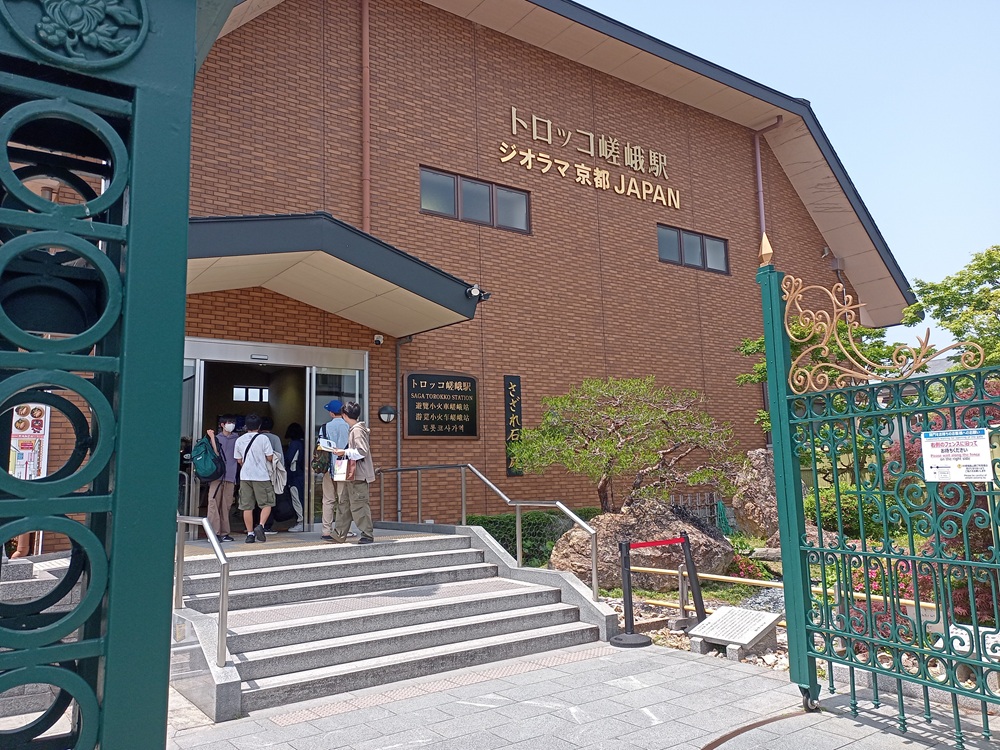 Bild 9-25: Eingang zur Station des Sightseeing Train. Die obere Zeichenfolge steht für „Torokko Saga-eki“ mit dem Fremdwort „Torokko“ als japanische Transkription des englischen Worts „truck“ in Katakana. Die untere Zeichenfolge steht für „Diorama Kyōto Japan“, da das Gebäude auch eine kleine Modellbahn beherbergt – die ein Kenner aber eher als „Spielbahn“ bezeichnen würde, auf der u. a. Thomas und seine Freunde umher kreisen. Das Fremdwort „Diorama“ ist hier ebenfalls in Katakana geschrieben.