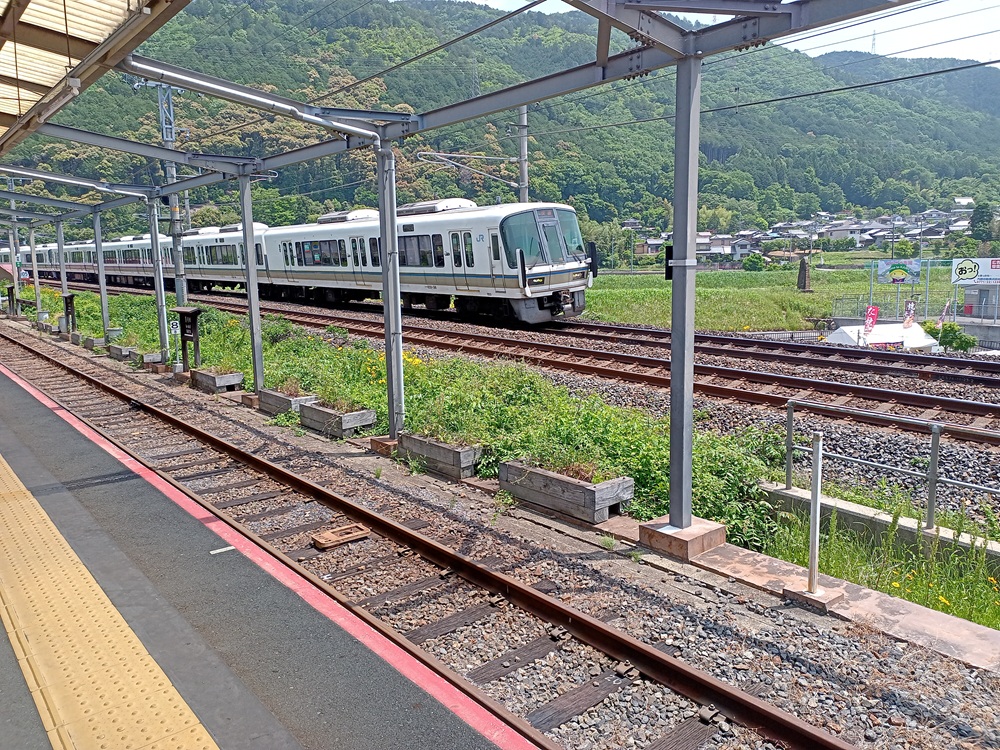 Dieses Verkehrsmittel, das korrekterweise natürlich keine Straßenbahn ist (und auch nur von diesem einen Schild so bezeichnet wird), möchten wir auf seiner nächsten Runde für unsere Rückfahrt nutzen. Dazu setzen wir die Fahrt erstmal entlang der JR-Neubaustrecke mit dem nächsten Local in Richtung Kameoka fort. Nach weiteren 4 Minuten Fahrzeit erreichen wir die Station Umahori im Osten von Kameoka.