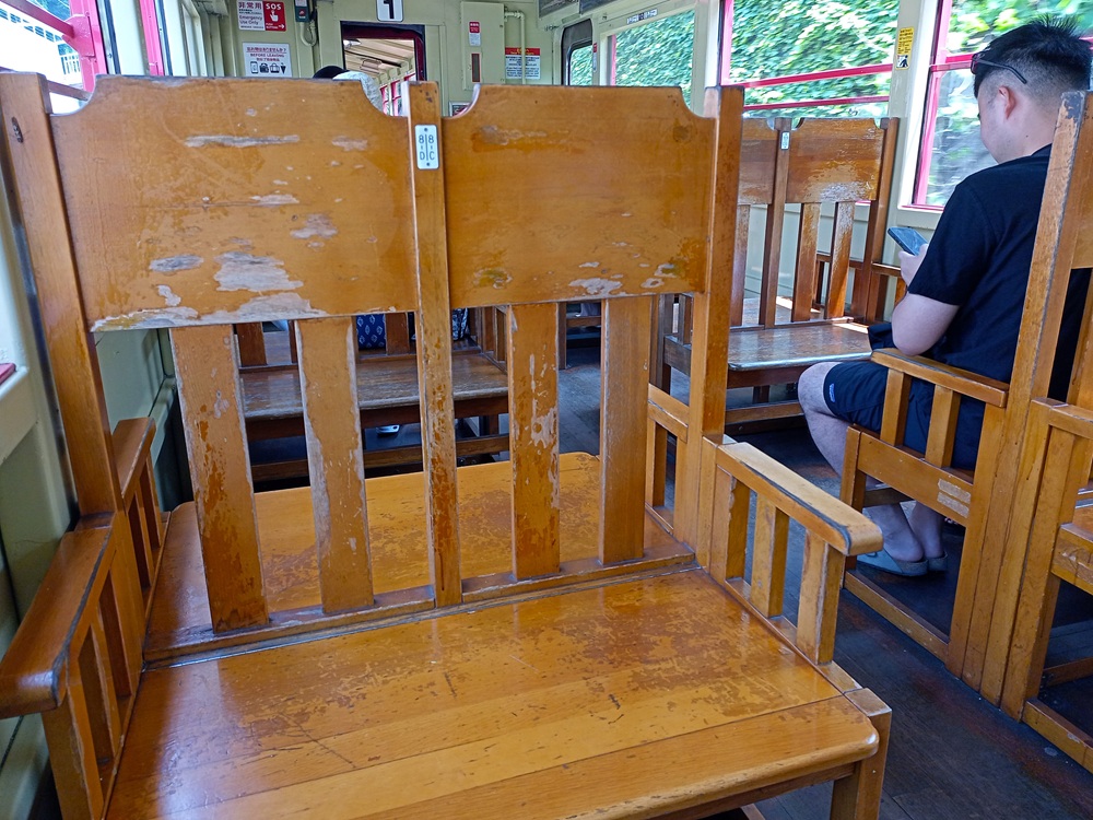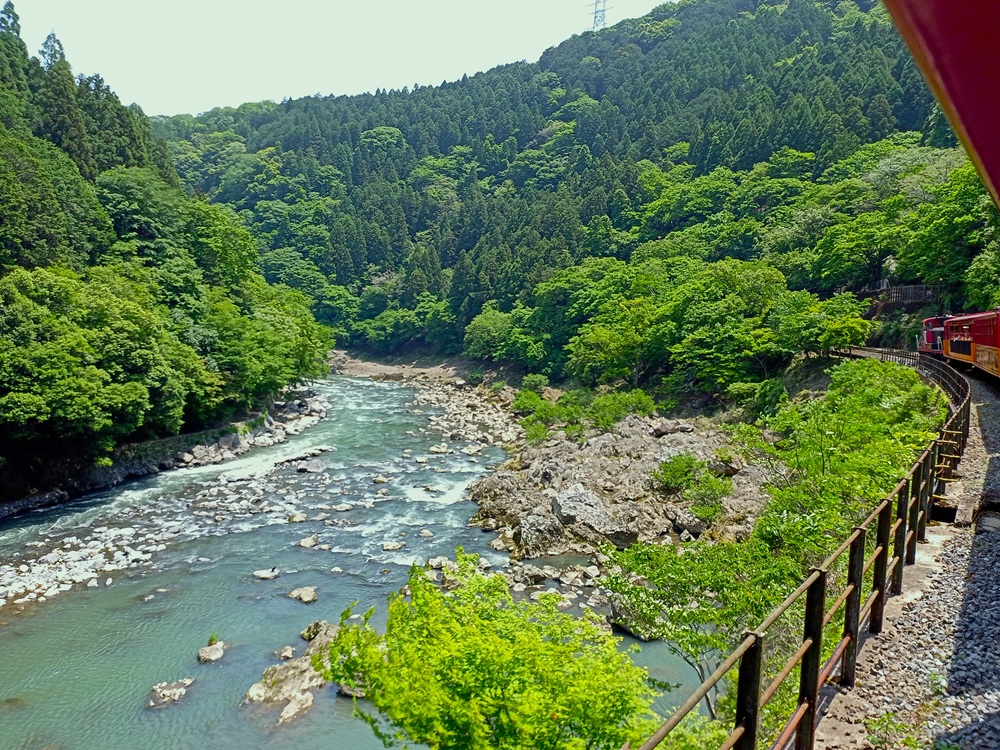 Der erste Wagen hinter der Lok ist sogar ein offener Wagen. Beim Wetter kann man sich aber im Voraus nicht sicher sein, sodass ich auf die Reservierung im offenen Wagen verzichtet habe. Der Sagano Sightseeing Train ist nämlich reservierungspflichtig und die Reservierung ist mit einem Vorlauf von einem Monat möglich. Bei erwartbar (aber nicht sicher) schönem Wetter sind manche Fahrten schon Tage vorher ausgebucht. Da möchte ich das Risiko, bei strömendem Regen im offenen Wagen zu sitzen, lieber nicht eingehen. Es sei aber erwähnt, dass die Lastrichtung bergwärts führt (von Saga-Arashiyama nach Kameoka). Dort steigen viele Fahrgäste um auf einen Bus und machen dann auf dem Rückweg die Bootstour, sodass der Zug in Richtung Arashiyama (talwärts) tendenziell weniger stark besetzt ist.