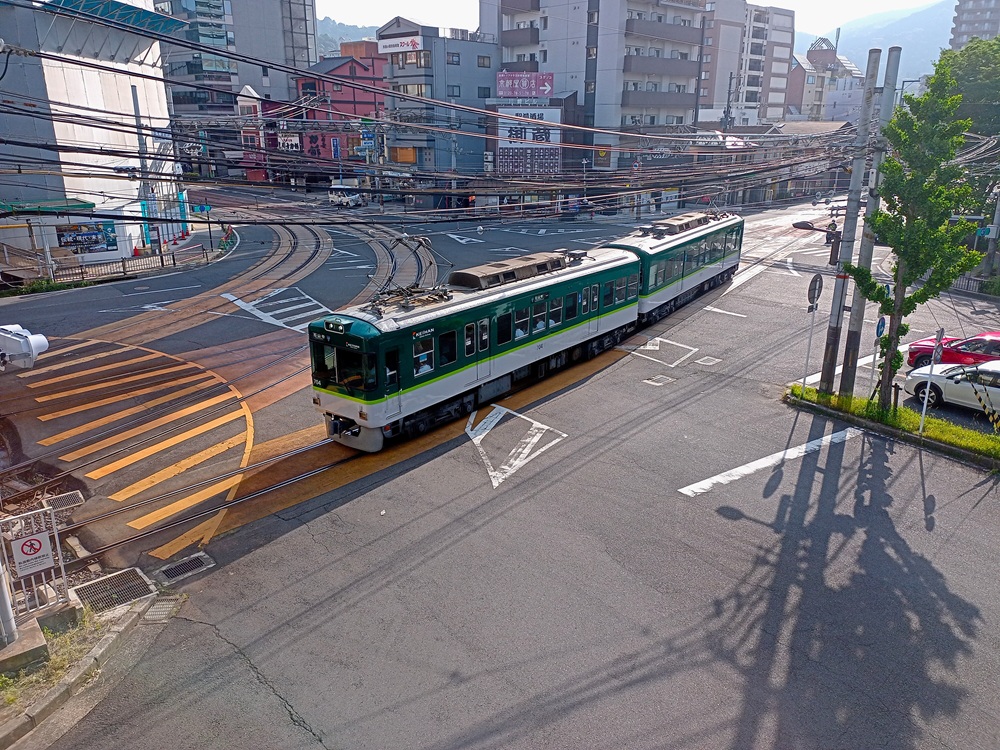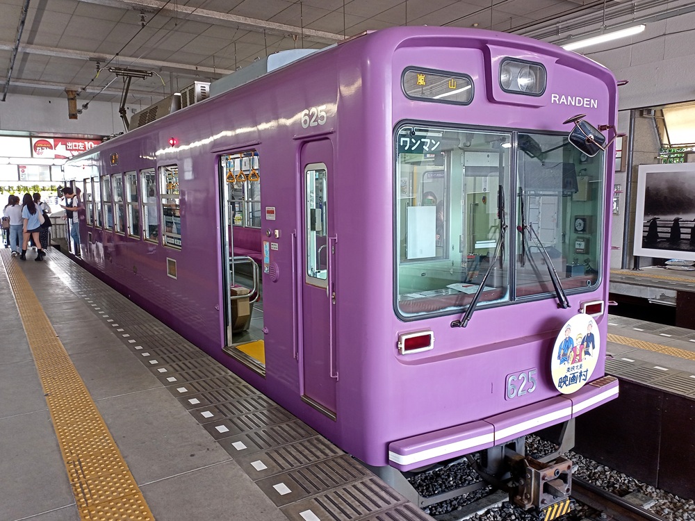 Die Randen wird von der Keifuku Electric Railroad betrieben. Das Straßenbahnnetz hat zwei Linien. Wir nutzen die Arashiyama Line auf der gesamten Länge von der Endstation Arashiyama nahe dem Tempel Tenryū-ji aus Bild 9-9 bis zur anderen Endstelle Shijō-Ōmiya in der Innenstadt. In Katabiranotsuji zweigt noch eine Nebenstrecke, die Kitano Line zur Erschließung der nordwestlichen Stadtteile, ab.