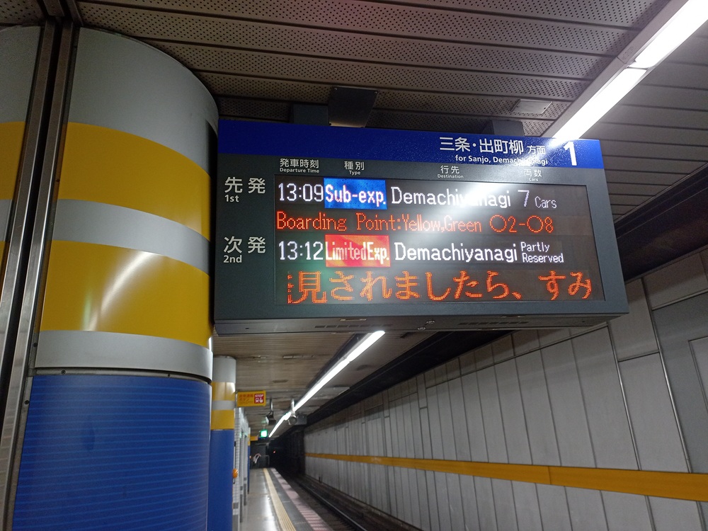 Bild 9-32: …der Limited Express überholt an der nächsten Station Sanjō den Sub-Express und erreicht danach ohne weiteren Halt als erstes den Endbahnhof Demachiyanagi. Wagen 4 des eigentlich ohne Aufpreis nutzbaren Limited Express ist ein Doppelstockwagen; die Sitze darin sind aber zuschlag- und reservierungspflichtig.