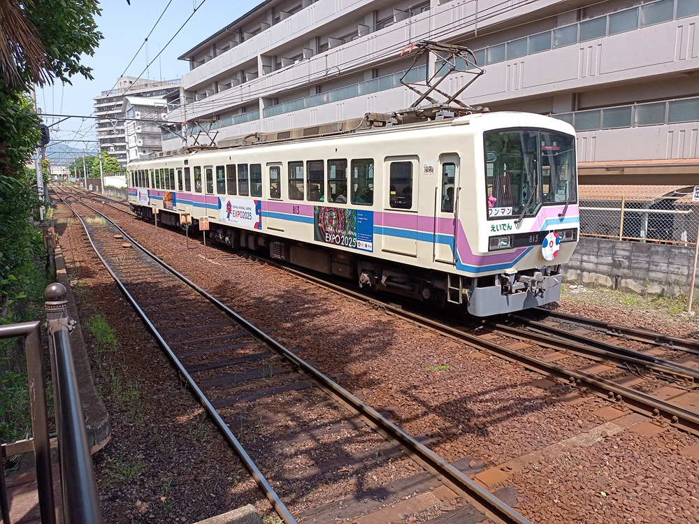 Bild 9-34: Zweiteiliger Triebwagen der Eizan Railway Baureihe 800 – mit Werbung für die EXPO 2025 😉 Die Zweiteiler werden überwiegend auf den Zügen eingesetzt, die in Takaragaike auf die „Nebenstrecke“ übergehen.