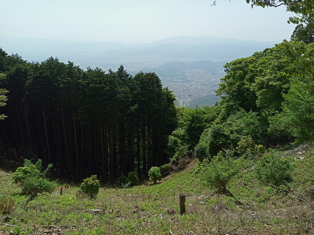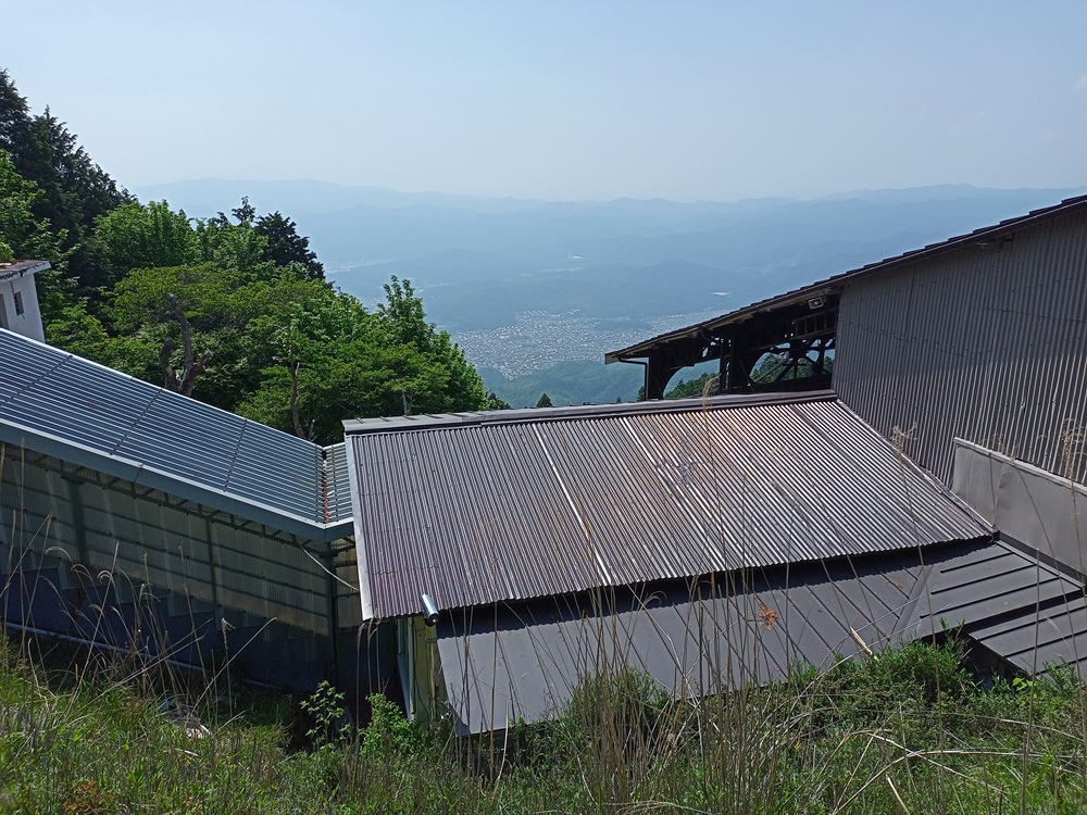 An der Bergstation liegt ein (kostenpflichtiger) Garten und dahinter ein großer Parkplatz, von dem aus Busse u. a. zurück nach Kyōto abfahren. Der Garten ist für Sparfüchse über einen kleinen asphaltierten Waldweg bequem zu umgehen. So erreichen wir kostenfrei den Parkplatz, der den höchsten öffentlich zugänglichen Punkt des Berges darstellt. Die eigentliche Gipfelmarke auf einer Höhe von 848 m ü. N. N. befindet sich in einem Sperrgebiet. Das macht aber nichts, denn auch vom Parkplatz aus kann man weit auf der anderen Seite des Berges in die Ferne schauen.