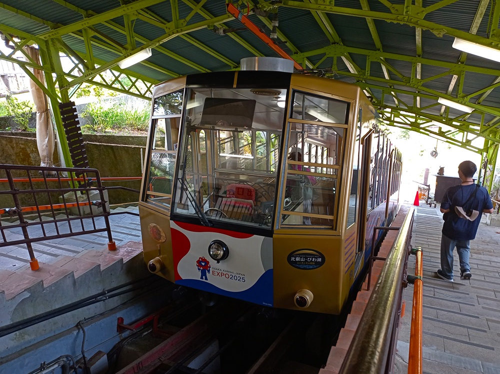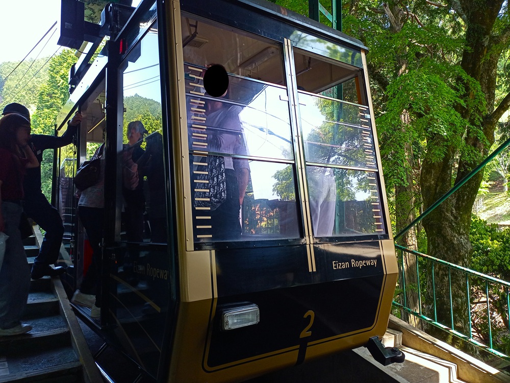 Die Standseilbahn gehört ebenfalls zur Eizan Railway, ist aber nicht mit Eisenbahn-Fahrkarten oder IC-Cards nutzbar. An der Talstation steht ein Automat, der Fahrscheine in Papierform ausgibt. Erhältlich sind Fahrscheine sowohl für die Standseilbahn als auch für die Kombination dieser mit der anschließenden Luftseilbahn. Wir kaufen einen Einzelfahrschein für beide Streckenabschnitte zum Preis von 950 Yen (5,95 €), der klassisch mit zwei Feldern zum „Knipsen“ daher kommt. Am Zugang zur Standseilbahn knipst uns die freundliche Mitarbeiterin das Feld für das Calbe Car ab und lässt uns passieren. Um 13:51 hat der Zug aus Demachiyanagi den Bahnhof Yase-Hieizanguchi erreicht und um 13:59 werden wir als letzter Fahrgast der 14:00-Abfahrt in die Standseilbahn gelassen. Perfekte zeitliche Präzision, denn die Standseilbahn fährt nur im Halbstundentakt.