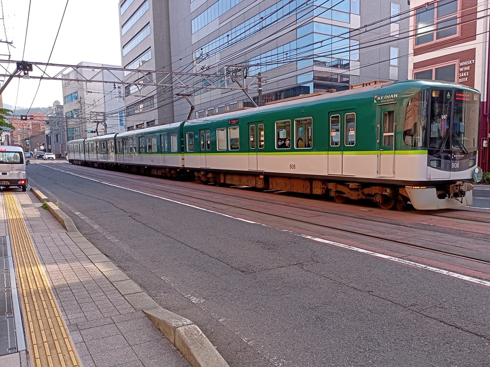 Die doppelte Zuglänge auf der Keishin Line geht allerdings mit der halben Taktfolge einher: Die Keishin Line fährt zur HVZ abends nur alle 15 Minuten, während die Ishiyama Sakamoto Line im 7,5-Minuten-Takt betrieben wird. Das Fahrgastaufkommen scheint auf beiden Linien ähnlich zu sein. Mit einem in Biwako-Hamaōtsu beginnenden Zug der Keishin Line fahren wir zurück in Richtung Kyōto.