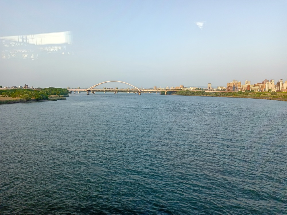 Bild 9-59: Kurz nach 18:00 quert der Zug den Yodo River zwischen den Bahnhöfen Shin-Ōsaka und Ōsaka.