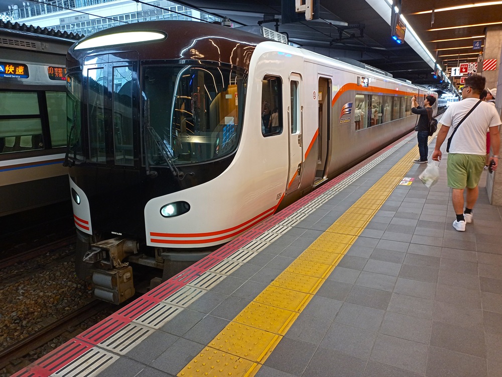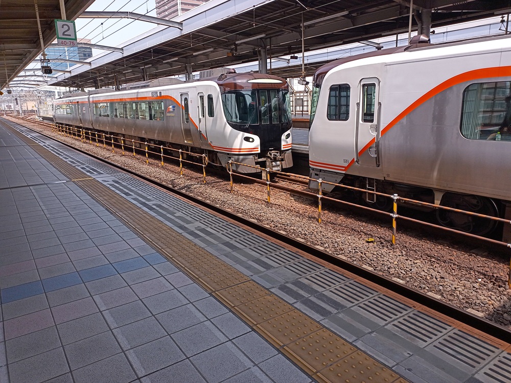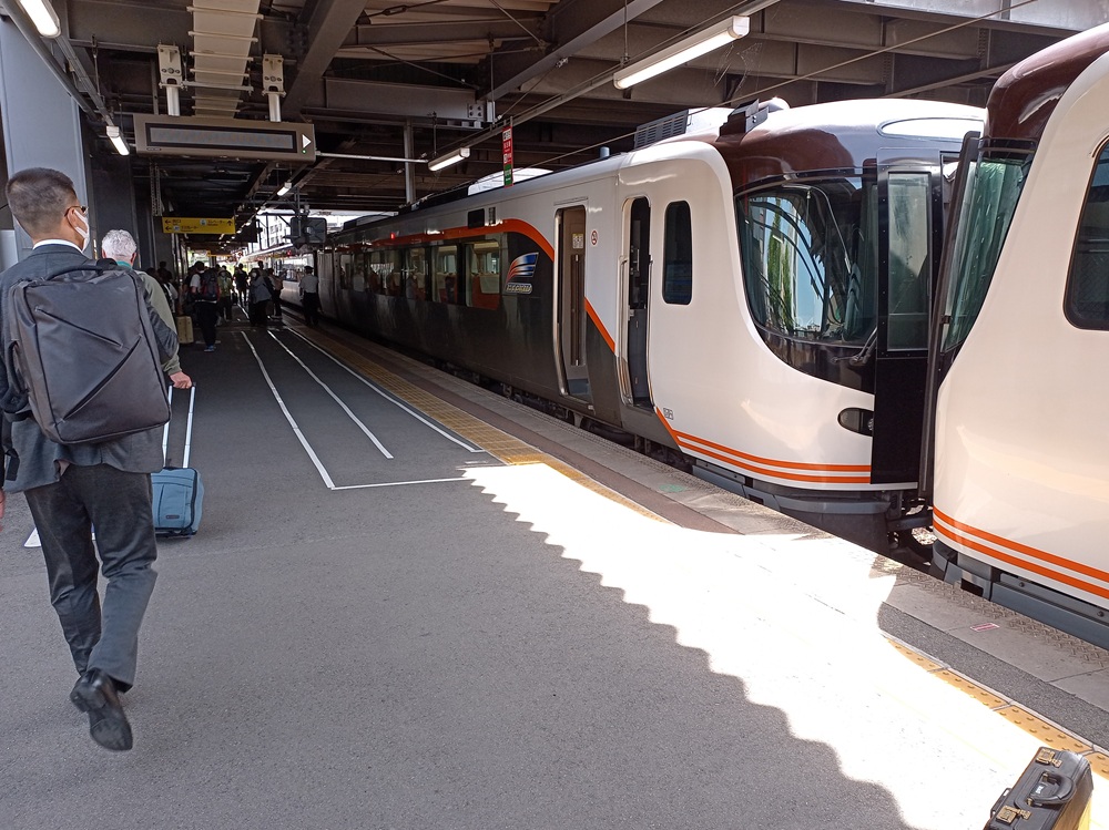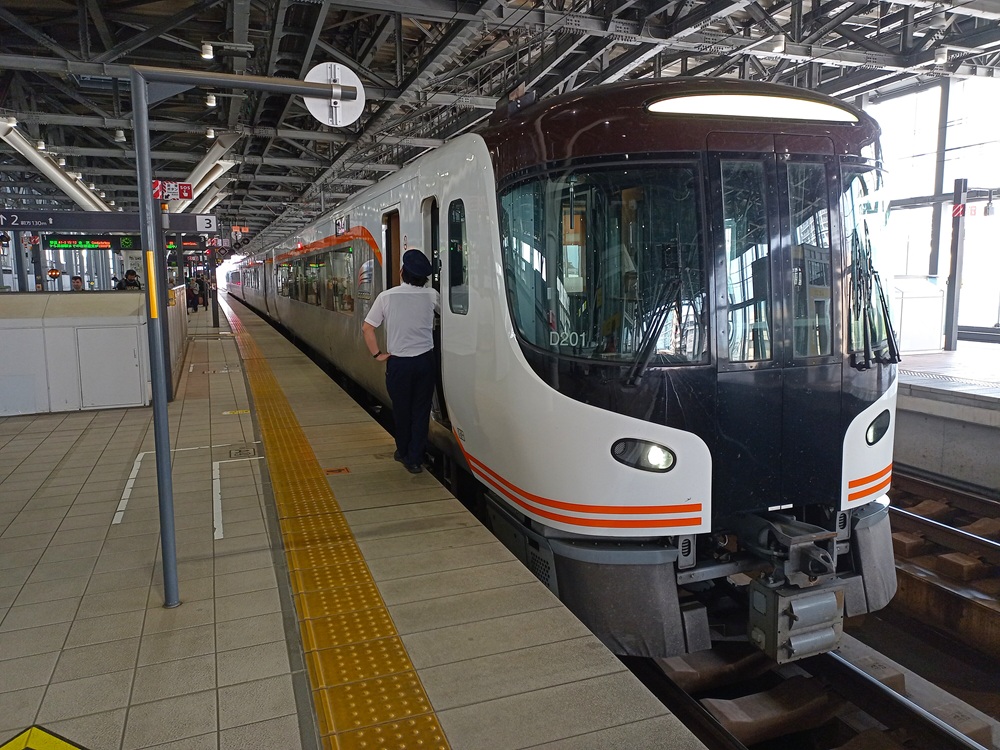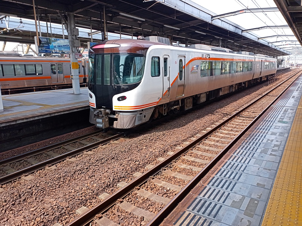 Warum JR Central auf dem Zugteil aus Nagoya ein deutlich größeres Fahrzeug einsetzt als auf dem Zugteil aus Ōsaka kann wohl nur das Unternehmen selbst beantworten – Potential für die Direktverbindung nach Kyōto und Ōsaka ist jedenfalls vorhanden. Möglicherweise geht es umlaufbedingt nicht anders, da der Laufweg nach Nagoya immerhin Regelweg des Limited Express Hida ist. Andererseits ist mit dem besagten Hikari 642 (Shin-Ōsaka 8:19 – Nagoya 9:25) und auch mit einigen späteren Nozomi der Hida 5 in Nagoya (ab 9:39) bequem erreichbar. Die Umsteigeverbindung in Nagoya ist also zeitlich attraktiver als die direkte Fahrt. Wie dem auch sei: Der Hida 5 steht am Bahnsteig und wartet auf das Ankuppeln des Zugteils aus Ōsaka…
