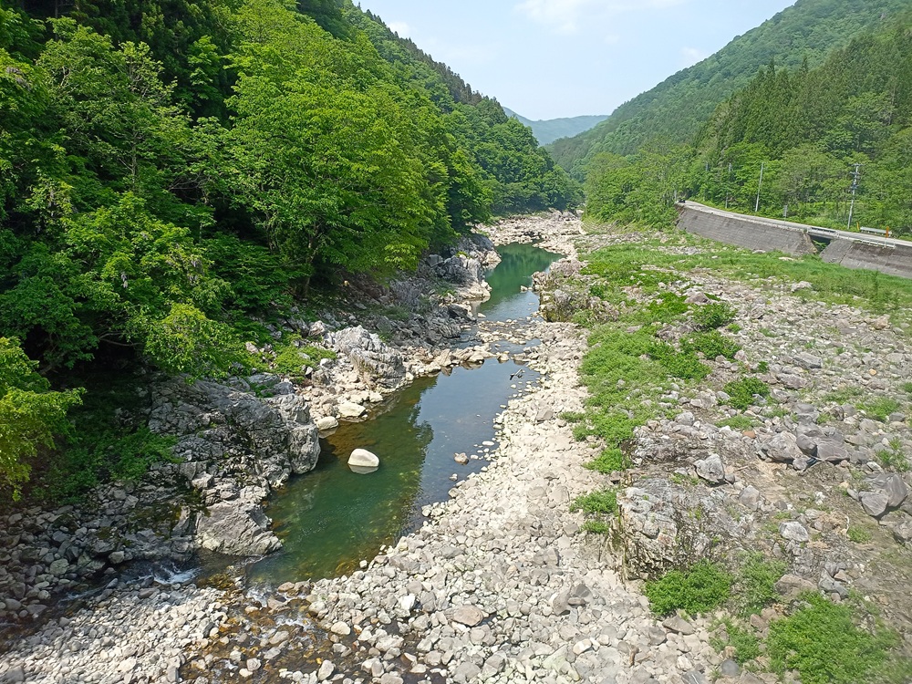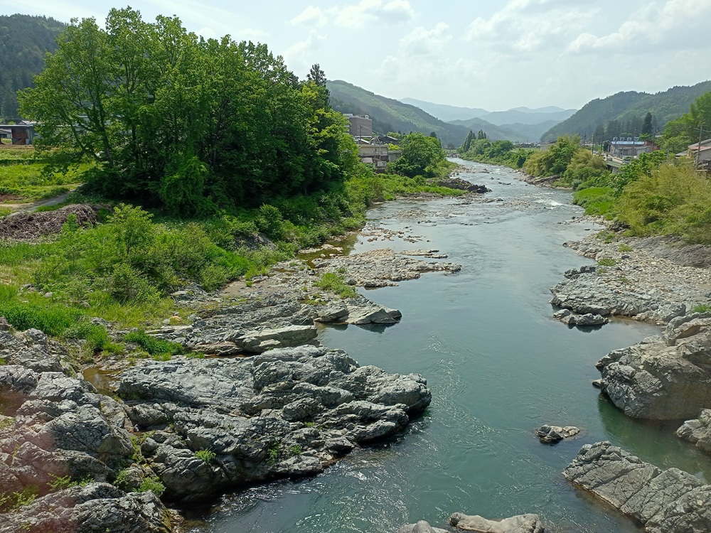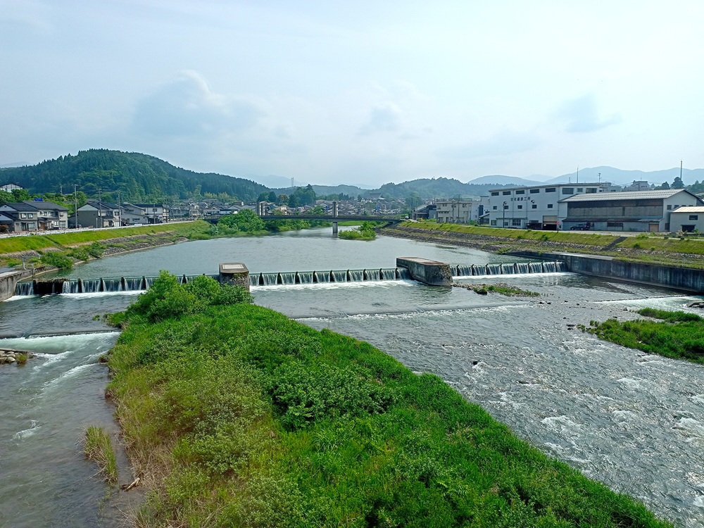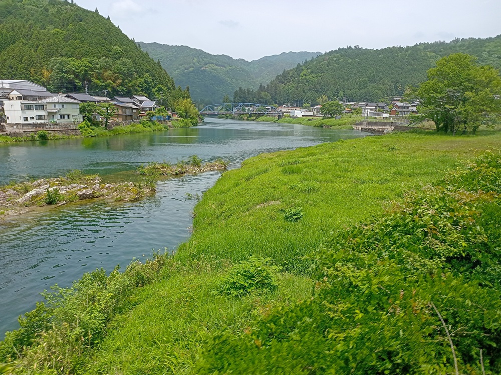 Für das Abhängen sind im Fahrplan 5 Minuten vorgesehen. Diese Zeit wird für das Manöver auch benötigt, sodass wir bei Abfahrt die 5 Minuten Verspätung beibehalten. Im weiteren Streckenverlauf folgen wir nun stromabwärts dem Miya River in Richtung Toyama.