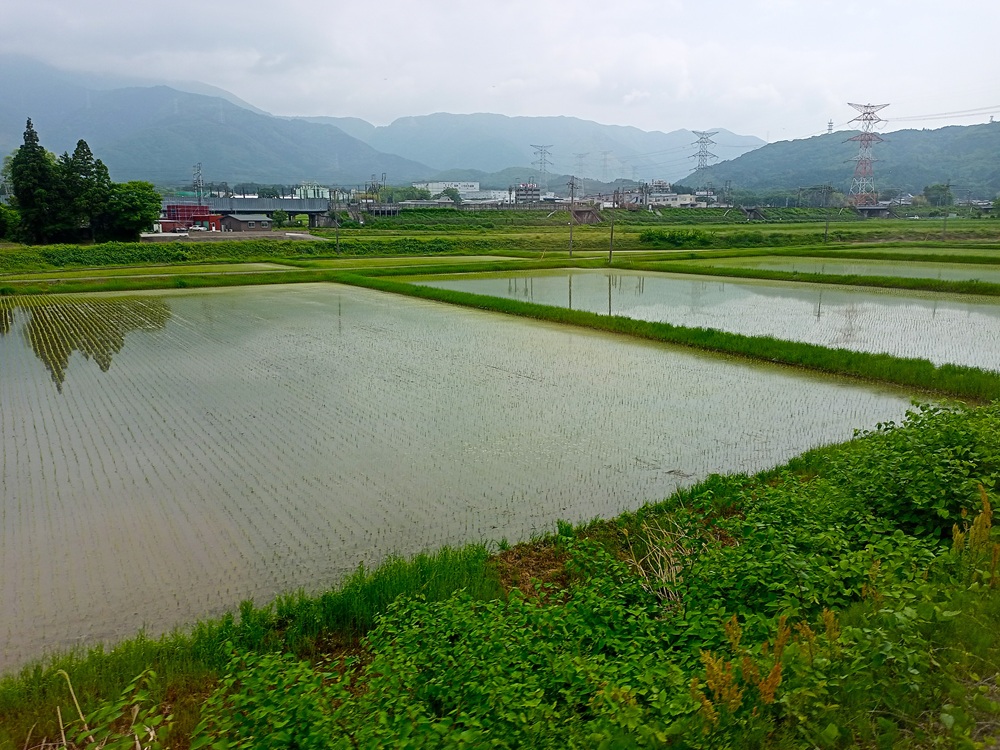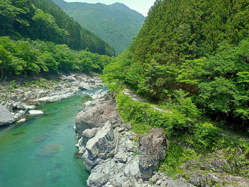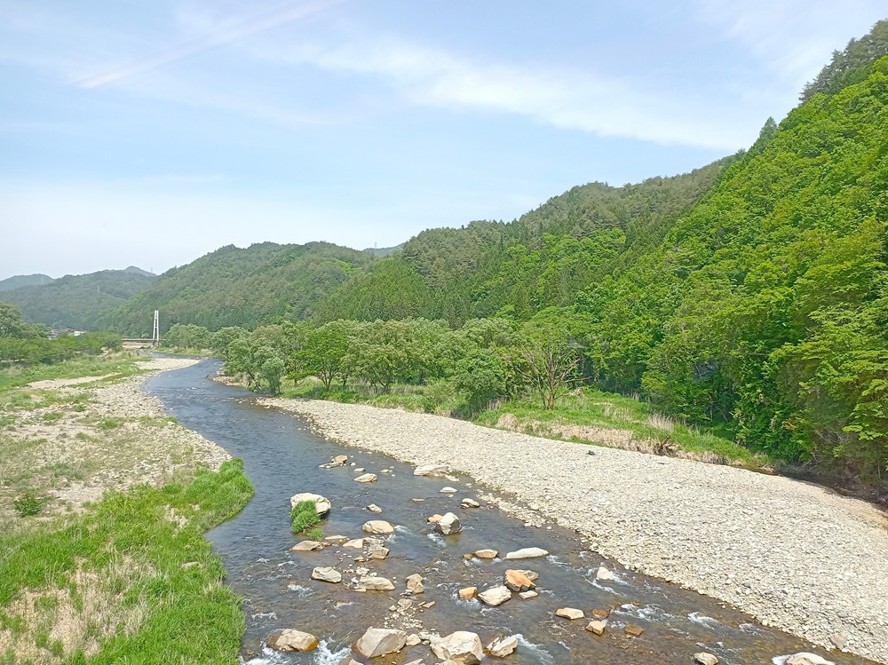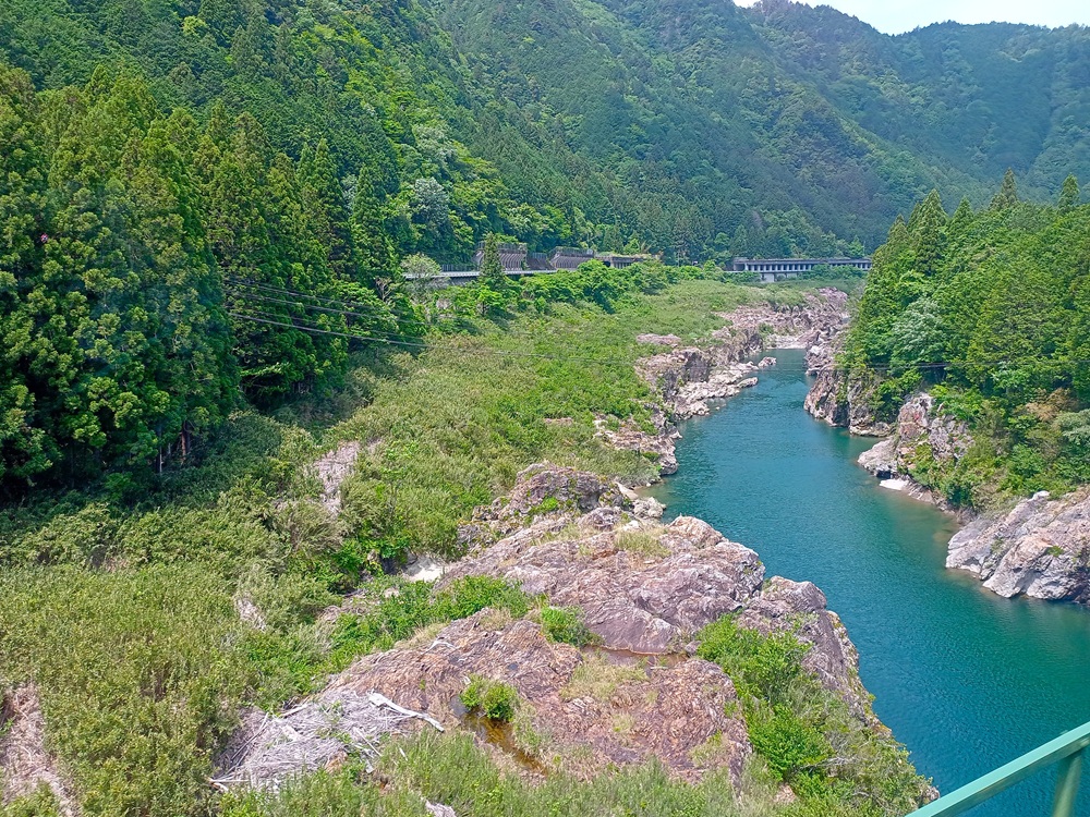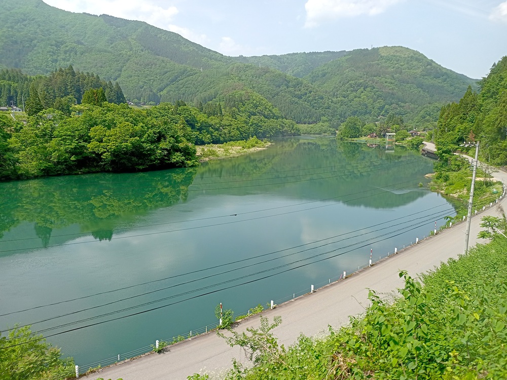 Für das Abhängen sind im Fahrplan 5 Minuten vorgesehen. Diese Zeit wird für das Manöver auch benötigt, sodass wir bei Abfahrt die 5 Minuten Verspätung beibehalten. Im weiteren Streckenverlauf folgen wir nun stromabwärts dem Miya River in Richtung Toyama.