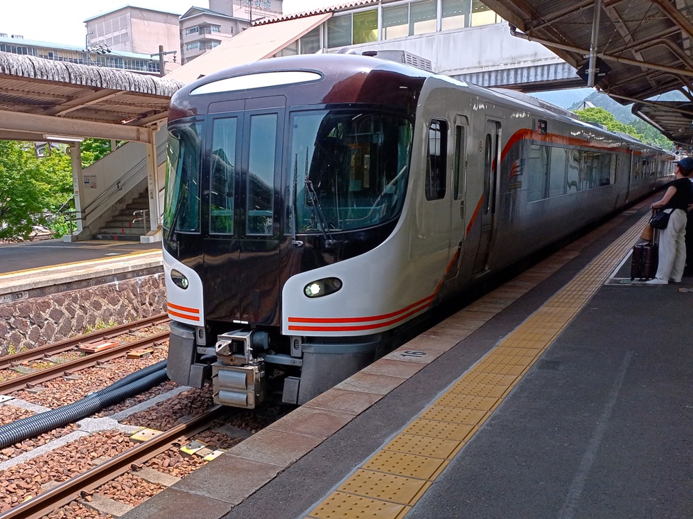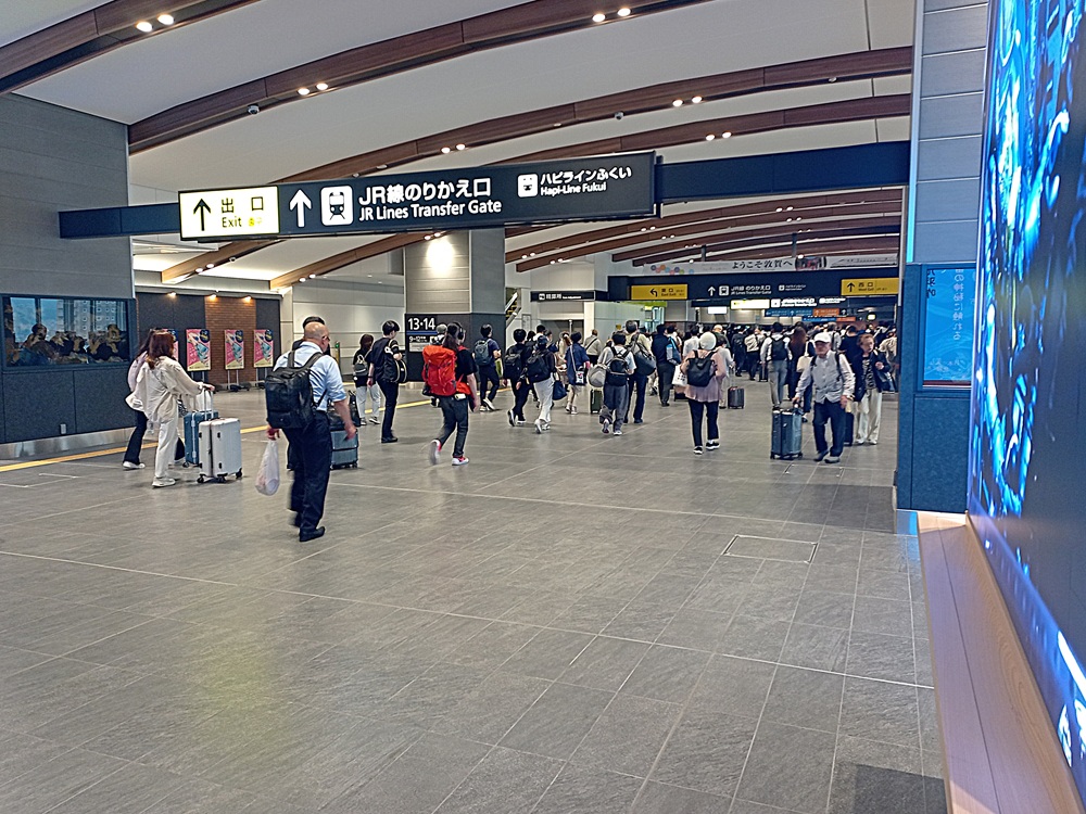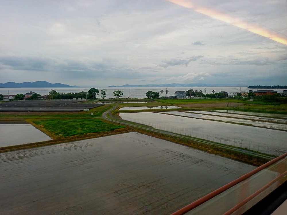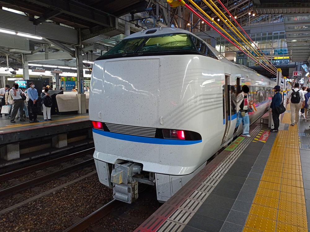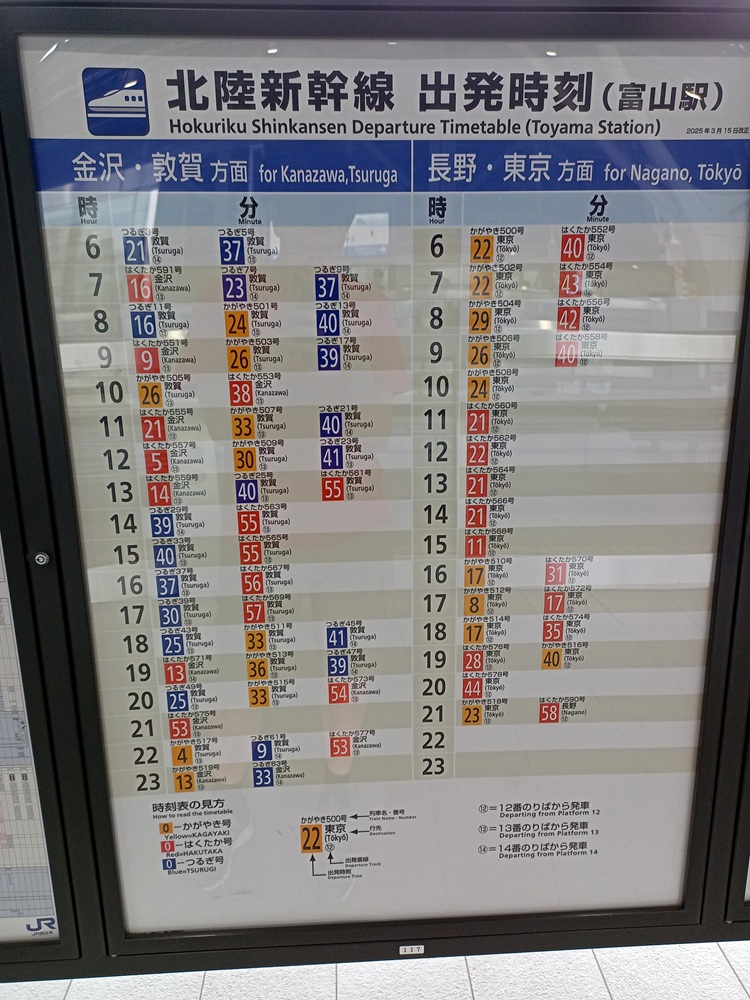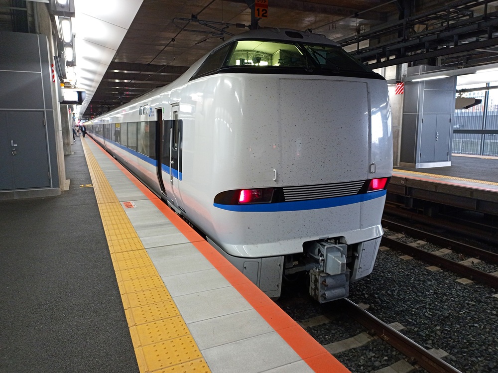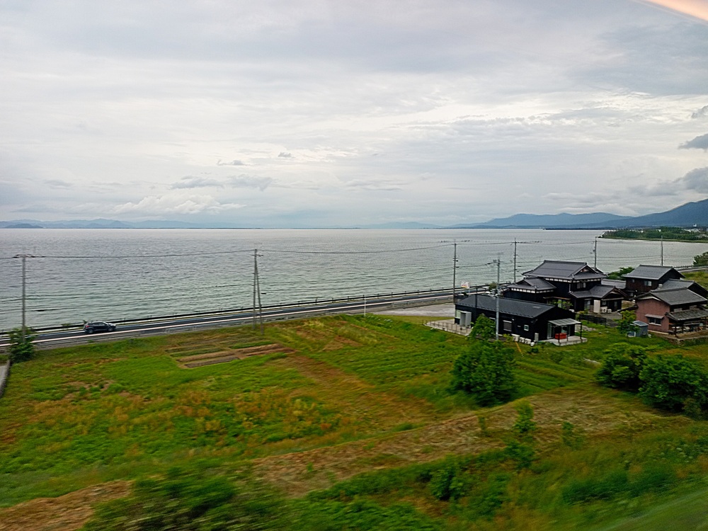 Vor der Shinkansen-Eröffnung fuhren die Limited Express noch durch bis Toyama, z. T. sogar noch weiter. Heute ist für die durchgehende Reisekette ein Umstieg erforderlich, der rund 10 Minuten des Zeitgewinns durch den Shinkansen-Ausbau aufzehrt. Wir nutzen zur Weiterfahrt den Thunderbird 34 nach Ōsaka. Kurz nach der Ausfahrt aus Tusruga legt sich der Regen und es bleibt zwar trüb, aber trocken.