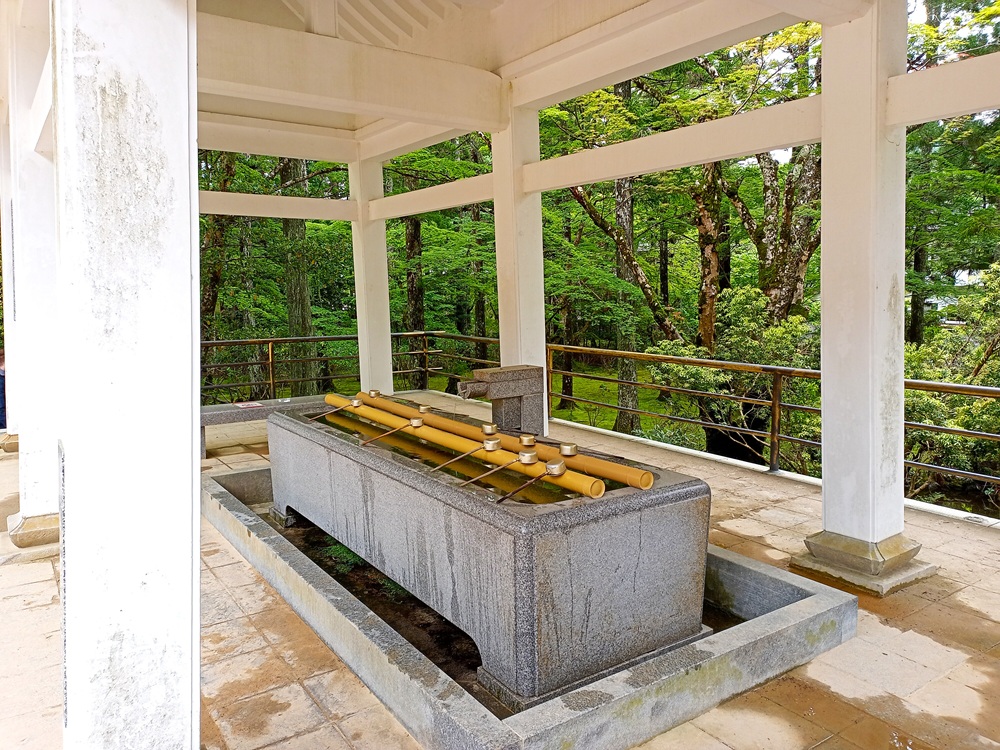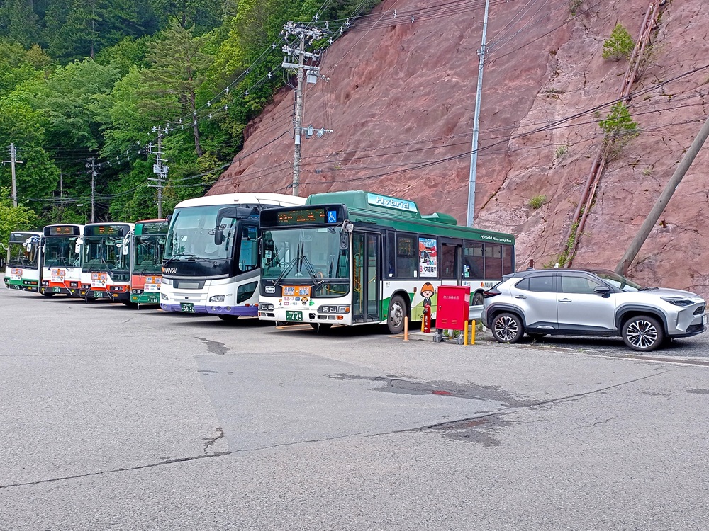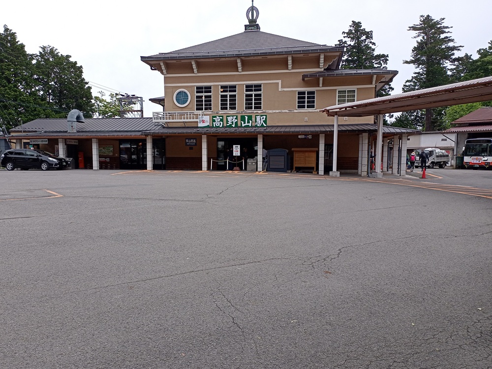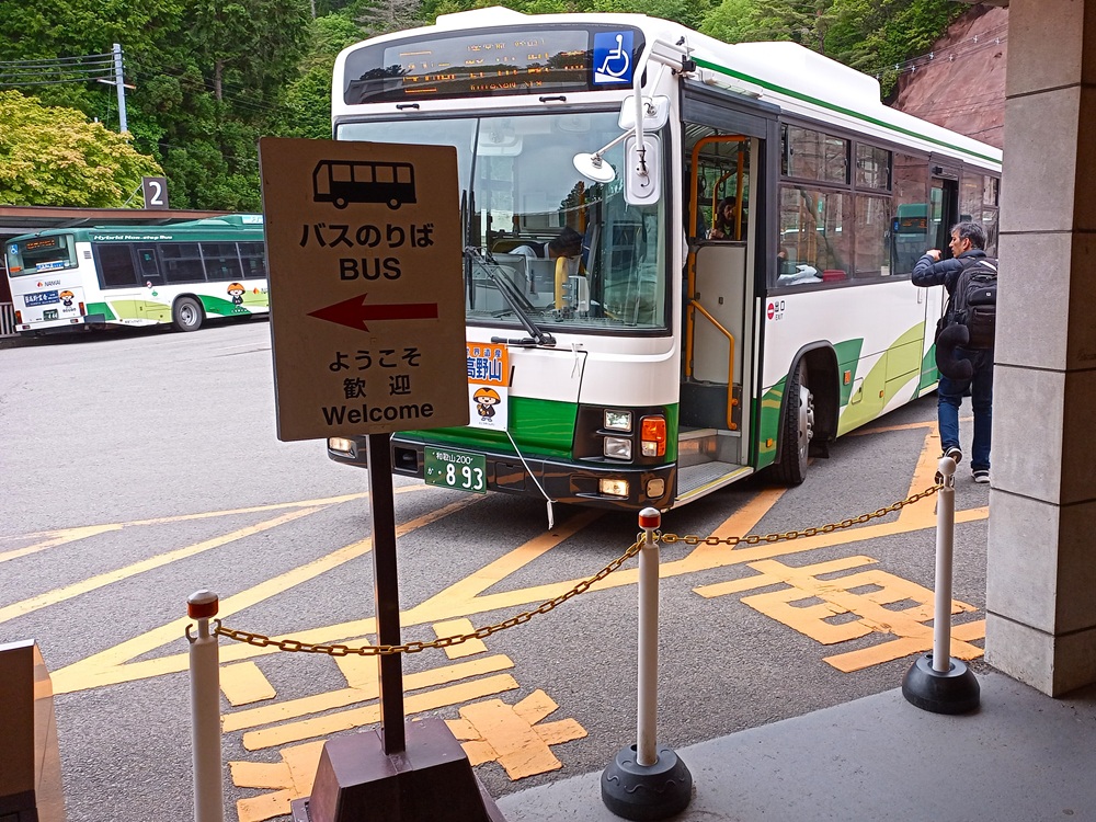 Der Bahnhof Kōyasan liegt rund 2 Kilometer nördlich der Ortschaft abermals mitten im Wald. Über eine kurvige Bergstraße, die noch eine weitere Passhöhe auf ca. 920 m ü. N. N. quert, ist der Bahnhof an die tiefer liegende Landstraße angebunden. Leider ist die Straße für Fußgänger gesperrt. Die meisten Reisenden der Standseilbahn nutzen für den Transfer in den Ort deshalb den Bus, der nicht dem Eisenbahntarif der Nankai Railway unterliegt. Eine Durchtarifierung mit der Zugfahrt von Ōsaka und / oder der Standseilbahn ist also nicht möglich. Dafür werden im Bus IC-Cards anerkannt. Abermals wird die Gefäßgröße nun kleiner, sodass pro Fahrt bei Bedarf mehrere Busse eingesetzt werden. In unserem Fall steht der Bus nach Kōyasan um 10:29 im Fahrplan. Wir nehmen im ersten Bus Platz, der nach der Ankunft der Standseilbahn schon bereit steht. Um 10:27 ist der Bus bereits voll, sodass der Fahrer vor Plan abfährt. Ein anderer Fahrer, der auf diesen Fall schon gewartet hat, fährt mit seinem Bus an die Abfahrtsposition vor, um die regulären Fahrlage der Linie 42 zu übernehmen. So kommen letztlich alle Fahrgäste aus dem Zug pünktlich ans Ziel.
