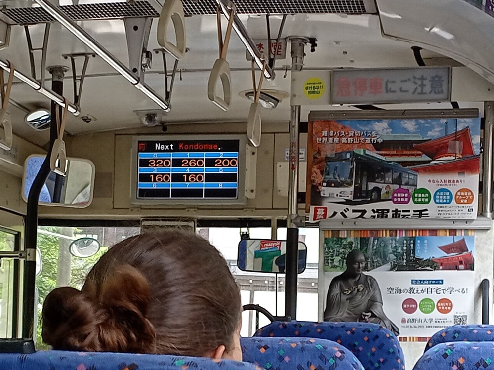 Inzwischen hat der Bus alle 9 Einstiegshaltestellen im Ort passiert und fährt über die Bergstraße dem Bahnhof entgegen. Der Preis für Fahrgäste, die seit Haltestelle Nr. 0 an Bord waren, beträgt nun nicht mehr 320 Yen, sondern 610 Yen (3,80 €). Wir sind an der Haltestelle Nr. 3 (Kongōbuji) eingestiegen, sodass unserer ICOCA beim Ausstieg gemäß Preistafel 460 Yen (2,90 €) abgezogen werden. Die angeschriebenen Preise gelten selbstverständlich auch bei Nutzung einer IC-Card 😉
