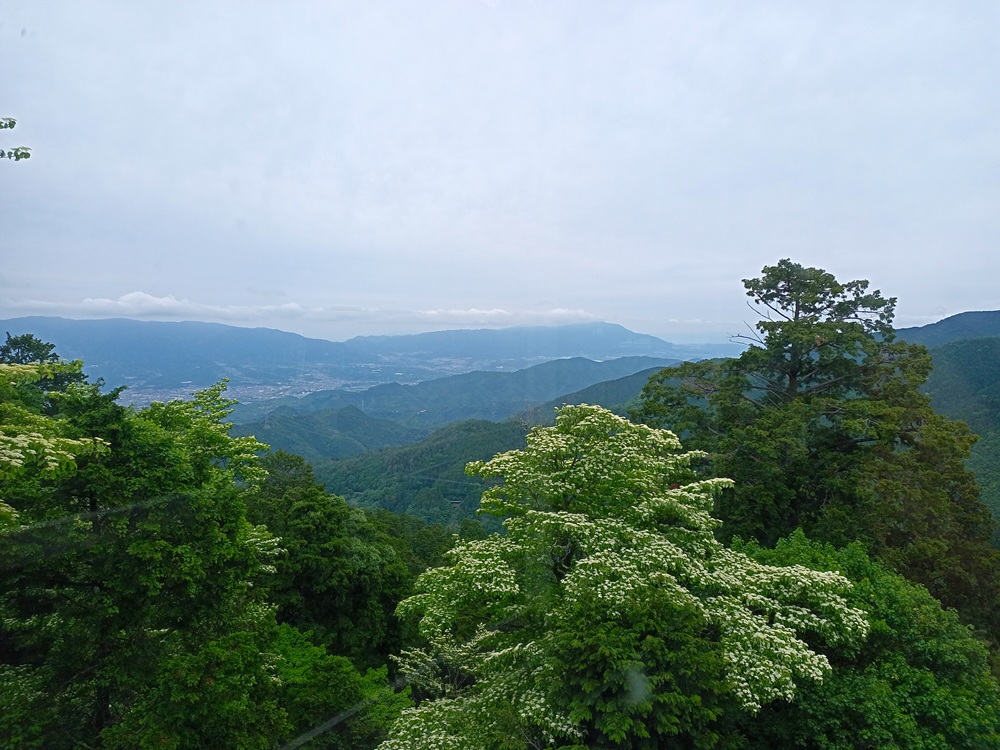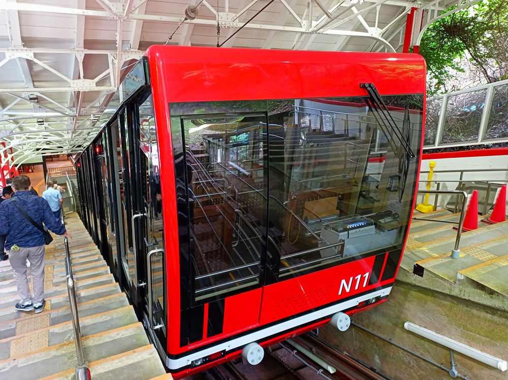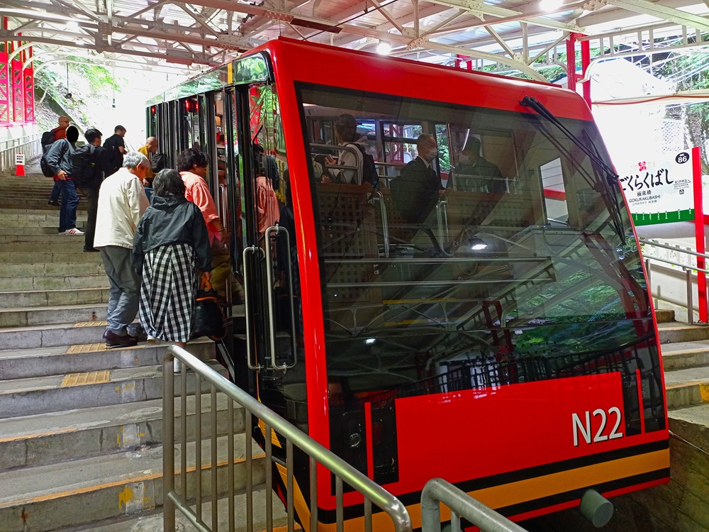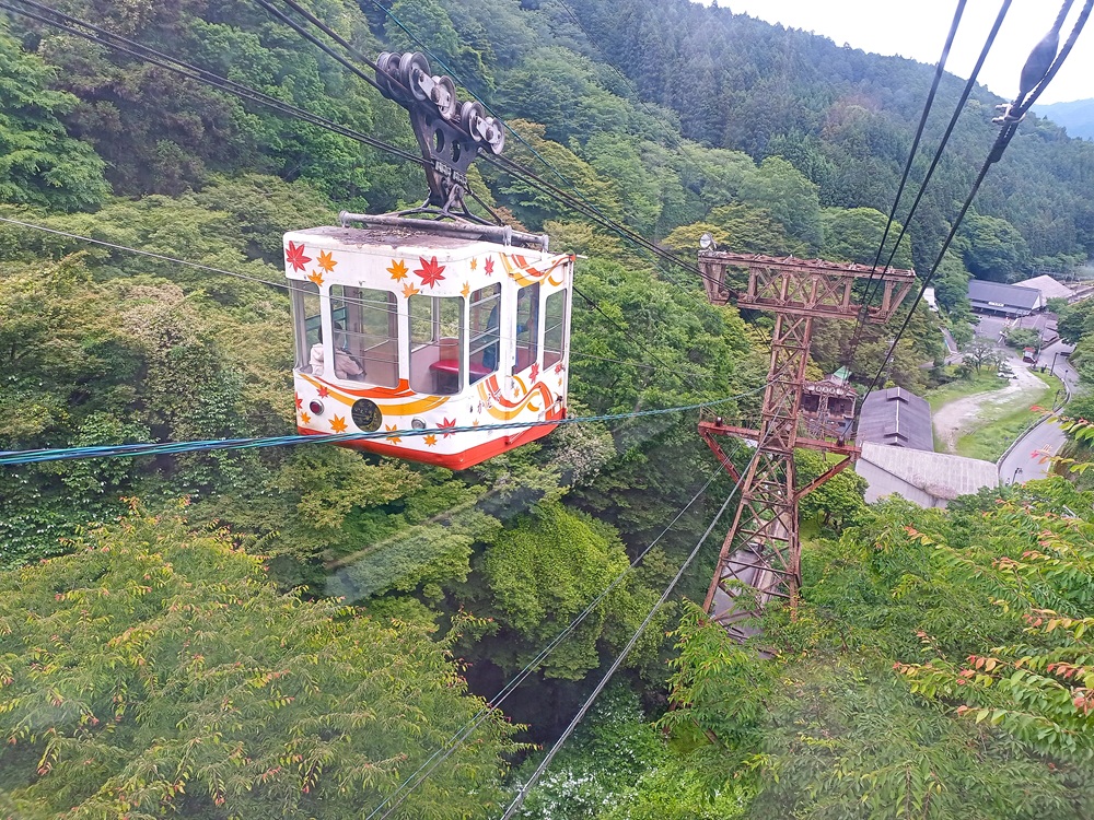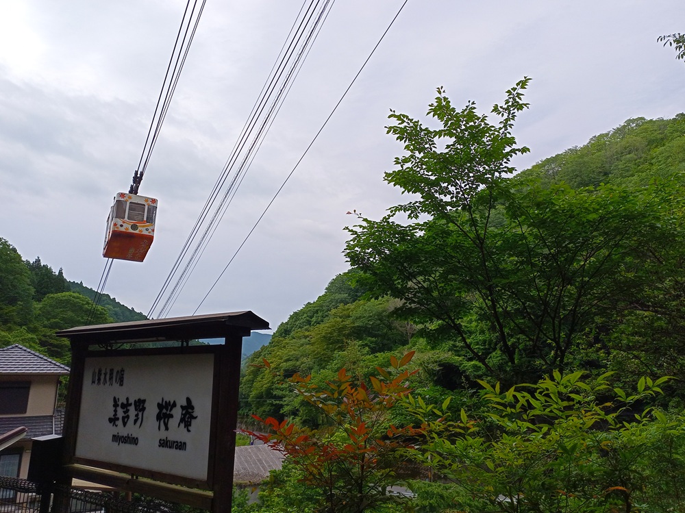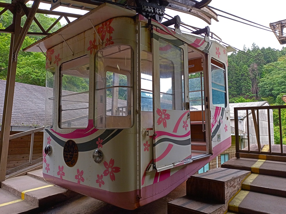 Die 1929 eröffnete Pendelbahn ist die älteste Seilbahn, die in Japan noch heute im aktiven Dienst steht. Das Fahrgastaufkommen außerhalb der Blütensaison ist allerdings recht gering – wir sind in unserer Gondel mit dem Seilbahnführer allein und talwärts sieht es ähnlich aus. Aus diesem Grund ist die Seilbahn nur von Freitag bis Montag in Betrieb; von Dienstag bis Donnerstag fährt ein Schienenersatzverkehr mit einem Pkw. 500 Yen (3,15 €) kostet die einfache Fahrt. Dafür kaufen wir an einem Fahrkartenautomaten eine Fahrkarte – die wir nach 10 Sekunden an den Seilbahnführer abgeben und somit wieder los sind.