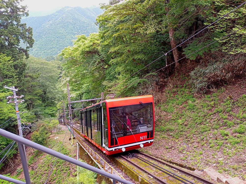 Zu Beginn bin ich noch skeptisch, ob die Fahrgäste aus dem 4-Wagen-Zug von Namba alle in die zweiteilige Standseilbahn passen. Der Seilbahnwagen ist innen aber sehr geräumig, sodass der komplette Zug mit nur einer Bergfahrt aufgenommen werden kann. Im Fall von Zurückbleibern würde die Standseilbahn wenige Minute später eine Sonderfahrt einlegen. Das Nankai Cable Car überwindet auf rund 800 Streckenmetern eine Höhendifferenz von 328 m und bringt uns so bis auf 867 m ü. N. N. An der Bergstation Kōyasan müssen Reisende erneut umsteigen.