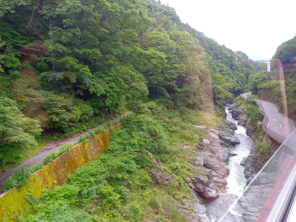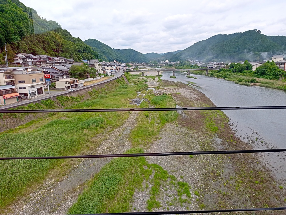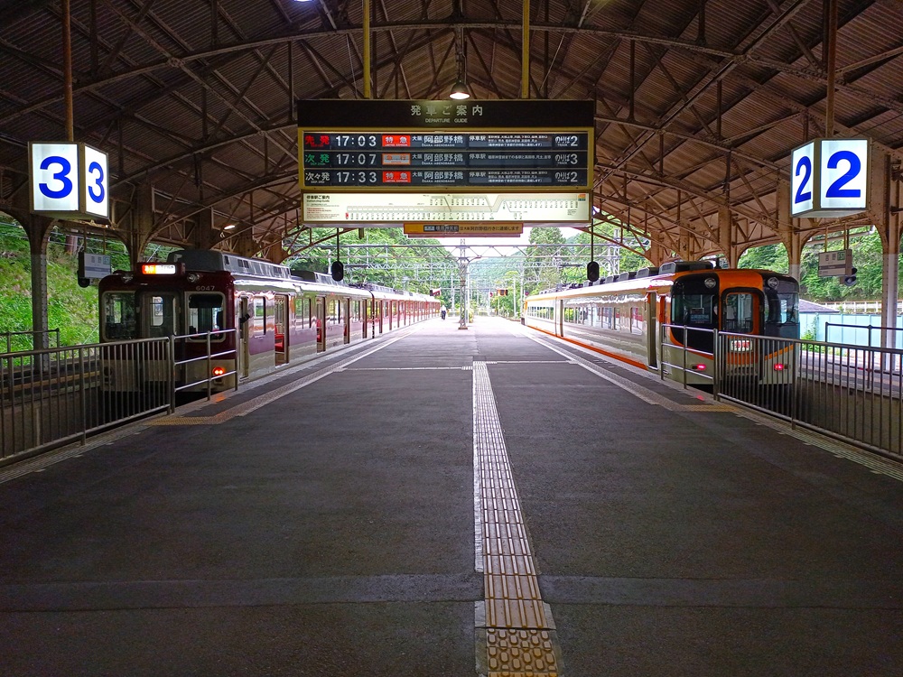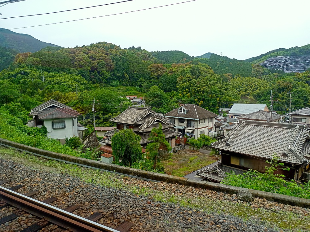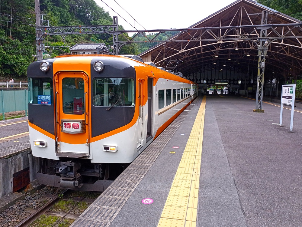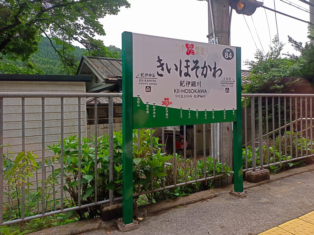 Von hier an wandelt sich die bis dahin eher flache zweigleisige Hauptstrecke zu einer eingleisigen Bergstrecke. Auf den folgenden 20 Kilometern fährt der Kōya über eine aufwändig trassierte Steilstrecke mit Steigungen bis 50 Promille, engen Radien, zahlreichen Tunneln sowie vielen Brücken und Viadukten tief in das Kii-Gebirge hinein. Von der Flussebene auf ca. 90 m ü. N. N. klettert unser Limited Express langsam hinauf bis auf ca. 540 m ü. N. N.