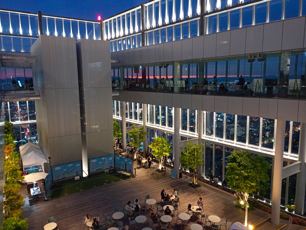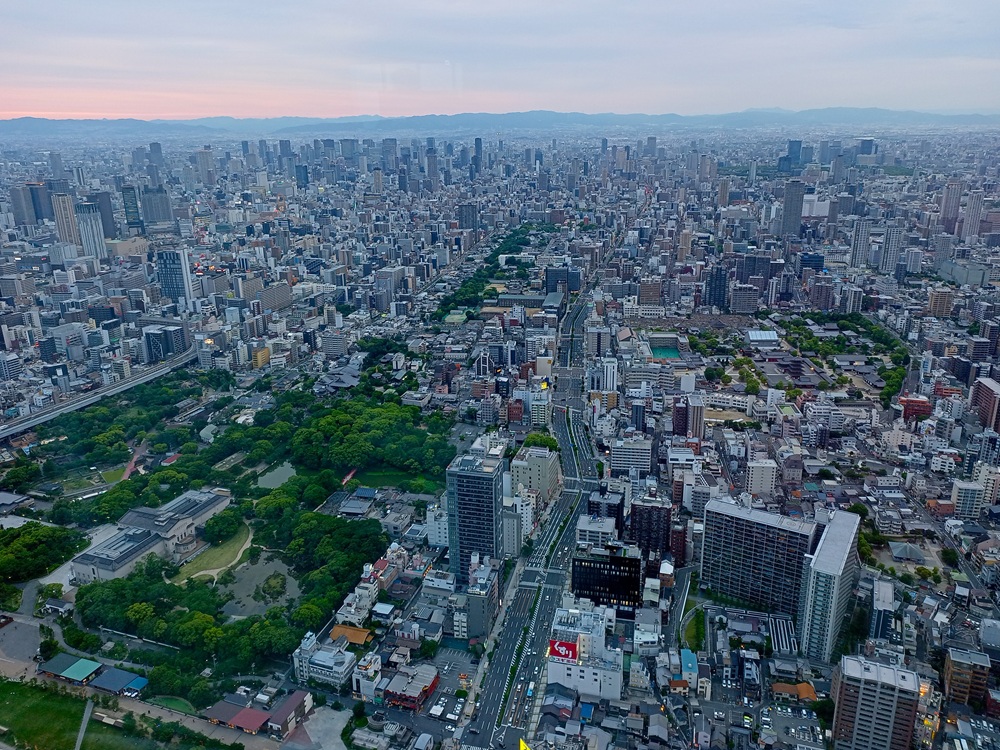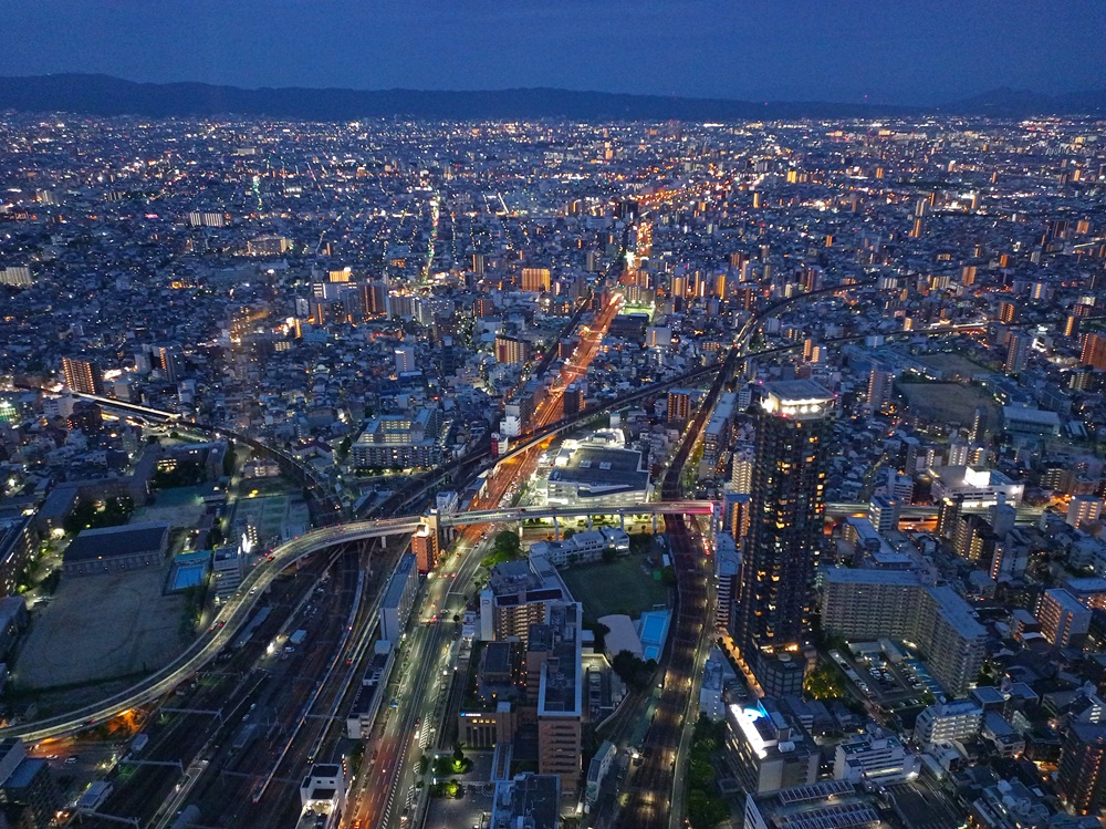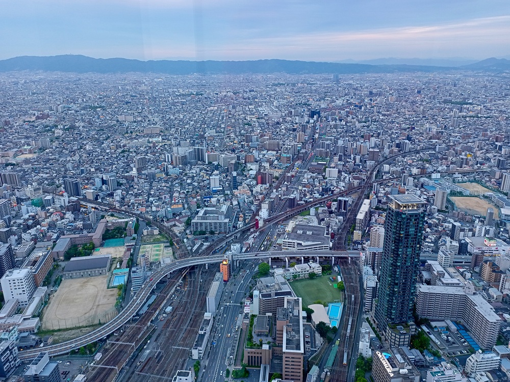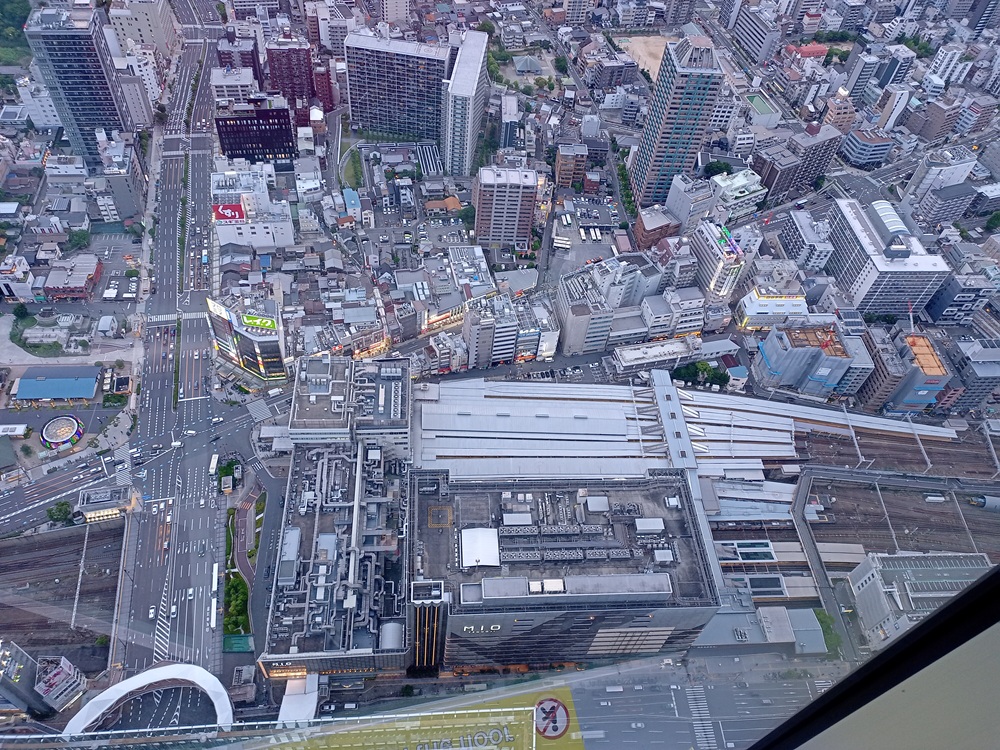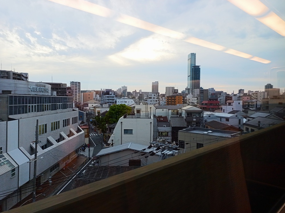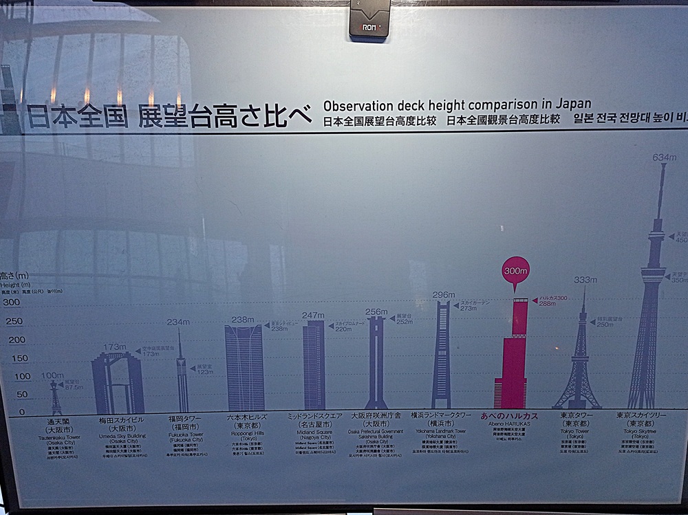 Über dem Bahnhof Ōsaka-Abenobashi erstreckt sich der 300 Meter hohe Wolkenkratzer „Abeno Harukas“ (Anmerkung: japanisch korrekt wäre die Rōmaji-Schreibweise „Abeno Harukasu“. Das „u“ am Wortende wird allerdings stimmlos – also fast stumm – ausgesprochen. Daher lassen die Betreiber es in der englischen Eigenschreibweise weg). Das höchste Gebäude der Stadt beherbergt neben einem Luxushotel und vielen Büroflächen auch eine Aussichtsplattform im 60. Stock auf fast 300 Metern Höhe. Da wir im Laufe der Berichtsreihe noch nicht genug Observatorien hatten, möchten wir natürlich auch dieses nicht auslassen 😉 Mit 2.000 Yen (12,50 €) ist Abeno Harukas die teuerste Aussichtsplattform auf dieser Reise, aber gleichzeitig auch die spektakulärste 🙂