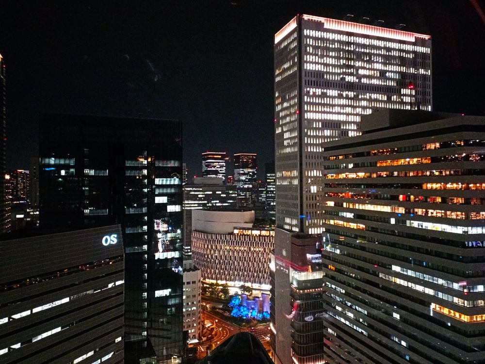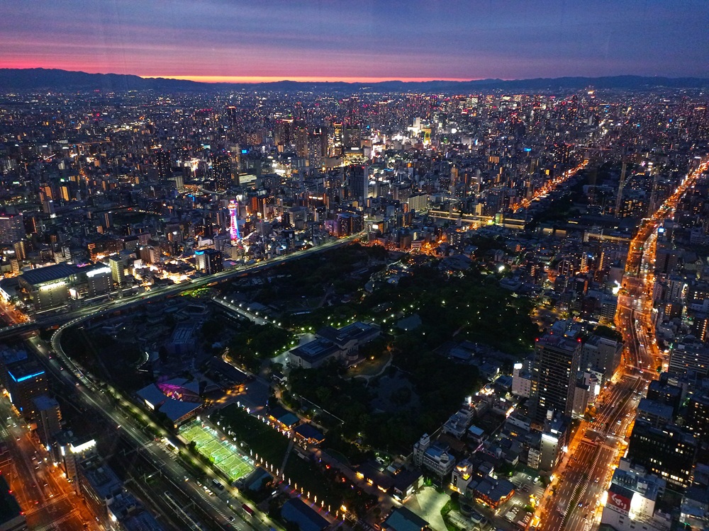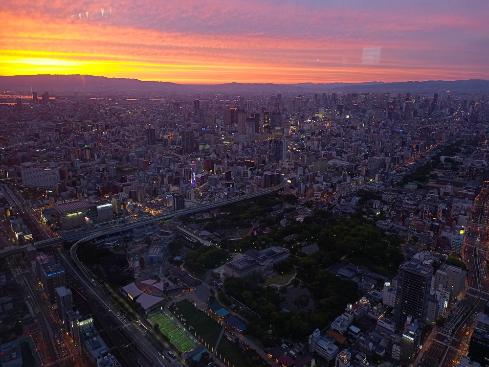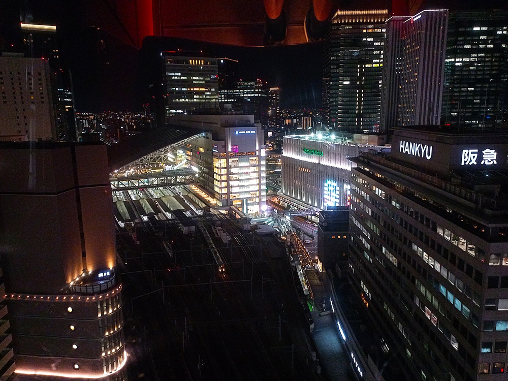 Insgesamt hat sich der Besuch an unserem letzten Abend in Ōsaka durchaus gelohnt. Ein farbenprächtiger Sonnenuntergang zum Ende des Urlaubs – was möchte man da noch mehr? Trotzdem: Einen Programmpunkt haben wir an diesem Abend noch, denn schon seit Tag 1 lacht mich dieses Riesenrad auf dem Einkaufszentrum neben unserem Hotel an, das ich jeden Tag beim Blick aus dem Fenster (z. B. in Bild 1-54) sehe. So bildet bei dann schon vollständiger Dunkelheit das Riesenrad den finalen Abschluss des Reisetages.