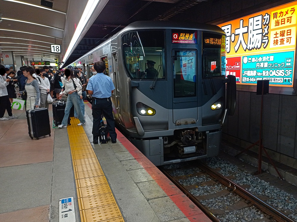 Die erste Fahrt in die Gemeinde Kōya wird von der Nankai Railway angeboten, die bereits an Tag 1 zur Anreise vom Flughafen nach Ōsaka genutzt haben. An der nahen Station Umeda besteigen wir die Ōsaka Metro Midōsuji Line zur Fahrt nach Namba, dem Endbahnhof der Nankai Railway. Das Problem in diesem Fall: An einem Montagmorgen gegen 8:00 ist der Ansturm auf die Metro so groß, dass trotz einer Zugfolgezeit von 2 Minuten nicht alle wartenden Fahrgäste durch den jeweils ankommenden Zug aufgenommen werden können! Wir reihen uns daher in die Warteschlange am Bahnsteig ein und rücken nach dem ersten Zug bis auf Position 3 vor. Damit kommen wir garantiert mit dem zweiten Zug mit, der sich allerdings erwartungsgemäß bis an die Belastungsgrenze füllt. Die medial aus Japan in Europa bekannten „U-Bahn-Drücker“ (jap. „oshiya“) – also Stationshelfer mit weißen Handschuhen, die Fahrgäste so lange in den Wagen drücken, bis die Türen zu gehen – gibt es zumindest außerhalb der Metropolregion Tōkyō nicht bzw. nicht mehr. Die Fahrgäste erkennen i. d. R. von sich aus, wann der Zug voll ist und sie lieber auf den nächsten warten sollten. Zudem werden zurückbleibende Fahrgäste meist bereits durch den nächsten Zug aufgenommen, sodass die Wartezeiten in Anbetracht der dichten Takte sehr kurz sind. Letztlich wird es so in den Zügen auch nicht voller als in der Berliner S 3 / S 9 eine halbe Stunde vor Einlassbeginn der InnoTrans 😉