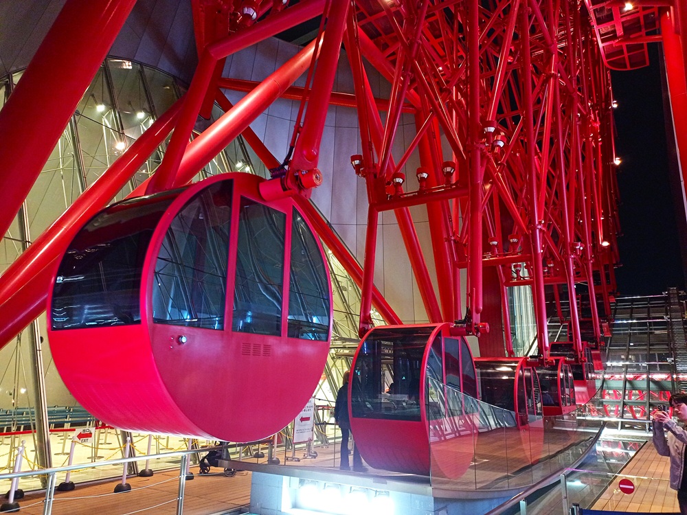 Das Riesenrad steht auf dem Dach des Einkaufszentrums HEP FIVE. Falls man sich auskennt, ist das Einkaufszentrum vom Bahnhof aus über die unterirdische Passage in rund 10 Minuten erreichbar. Nach einigen Rolltreppen finden wir im 7. Stock einen Automaten, der uns gegen den Einwurf von 800 Yen (5,00 €) eine Eintrittskarte ausstellt. Damit kann die 15-minütige „Rundfahrt“ beginnen.