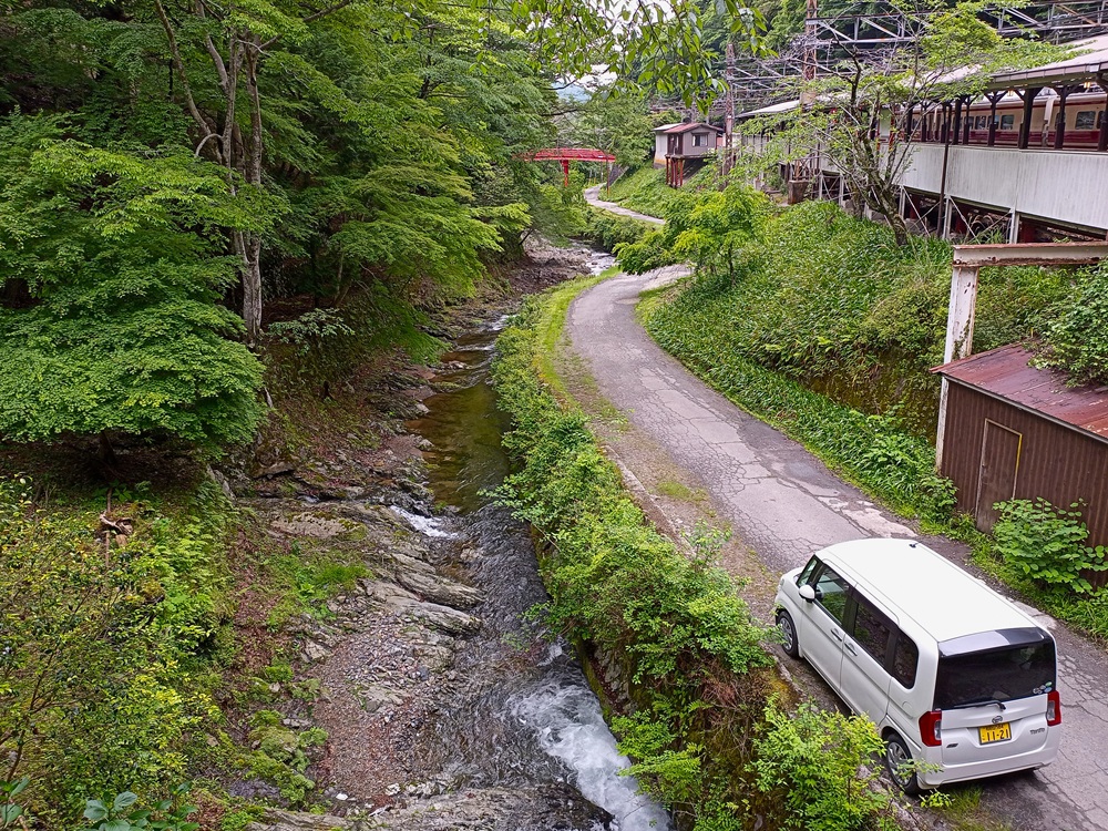 Der Bahnhof, obwohl für den Saisonverkehr großzügig dimensioniert, ist außerhalb der Saison „unstaffed“. Somit ist auch hier ein freier Zugang zum Bahnsteig möglich (und rein technisch wäre es möglich gewesen, von Yoshinoguchi bis hierher ohne Fahrschein zu fahren – also eine Lücke im geschlossenen System!). Für ankommende Fahrgäste steht ein Sammelbehälter bereit, indem sie ihre entwerteten Papierfahrkarten nach der Fahrt entsorgen können.