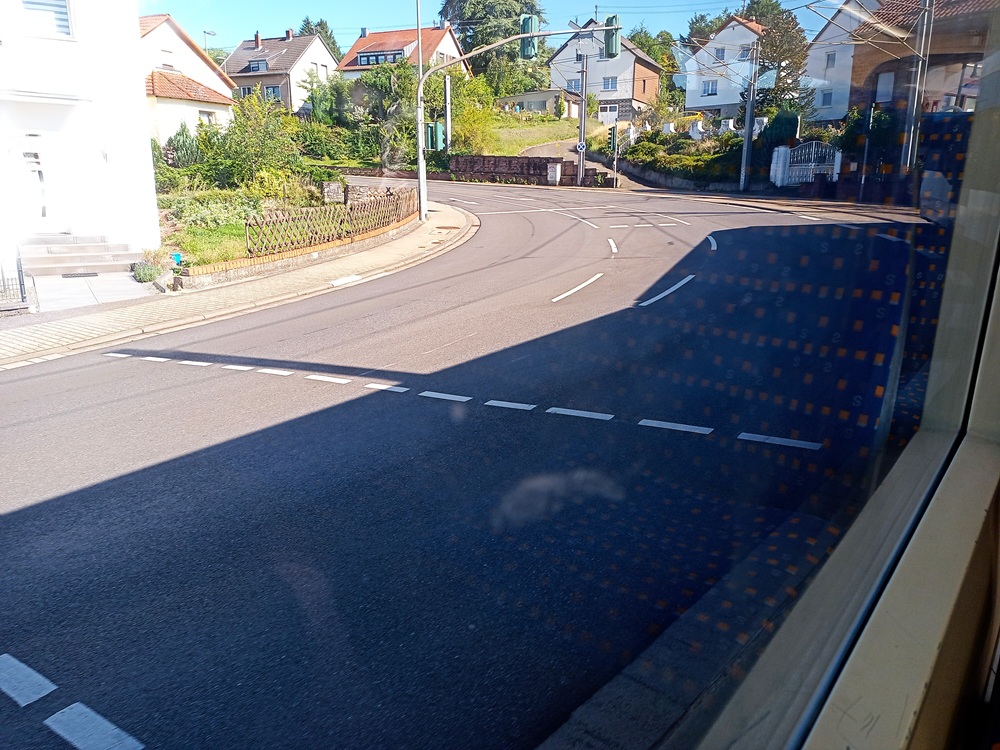 Am Haltepunkt Lebach-Jabach können wir an diesem Tag auf die Saarbahn jedoch vergeblich warten, denn deren Züge verkehren nur zur HVZ früh und zwischen 12:00 und 16:00 bis Jabach. Sonst wenden sie bereits am Bahnhof Lebach im Zentrum der Gemeinde. Daher wechseln wir zur nahen Bushaltestelle Seminarweg und warten dort auf die „Plus-Bus“-Linie R5 der Kreisverkehrsbetriebe Saarlouis. Der Bus erreicht die Haltestelle, die sich fast am Ende des langen Linienweges von Saarlouis über Dillingen nach Lebach befindet, mit leichter Verspätung. Leider bleibt es nicht dabei, denn auf der Dillinger Straße (B 269) hat sich in der Ortsdurchfahrt ein langer Rückstau gebildet. Ursache ist eine Baustellenampel in der Saarbrücker Straße (B 268) kurz hinter dem Kreisverkehr, an dem sich beide Bundesstraßen treffen. Dadurch stauen sich Fahrzeuge in den Kreisverkehr zurück und blockieren die Kreisfahrbahn für Fahrzeuge aus unserer Straße in Richtung Innenstadt. Im Schritttempo tasten wir uns vorwärts und können nach rund 10 Minuten endlich in den Kreisverkehr einfahren. Die Weiterfahrt zum Bahnhof dauert dann zwar nicht mehr lange, aber für den Umstieg zur Saarbahn bleibt theoretisch nur noch eine Minute. Tatsächlich gestaltet sich der Übergang deutlich entspannter, denn…
