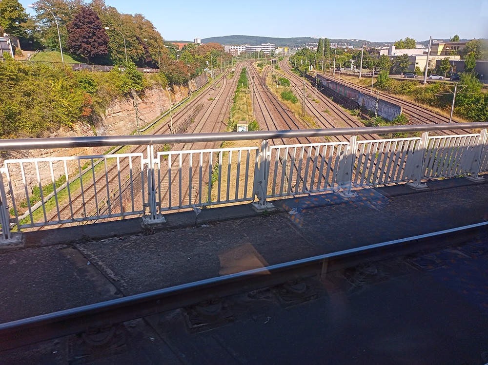 Nachdem der TGV den Weichenbereich freigefahren hat, dürfen wir den Bahnhof mit ca. +5 endlich verlassen. Die RB 72 befährt ab Saarbrücken zunächst die elektrifizierte Strecke Saarbrücken – Wemmetsweiler – Neunkirchen. Kurz vor Wemmetsweiler biegt der Zug an einem Gleisdreieck ab auf die eingleisige Strecke über Illingen nach Lebach. Das Gleisdreieck wird im planmäßigen SPNV durch drei Linien in allen Richtungen befahren: