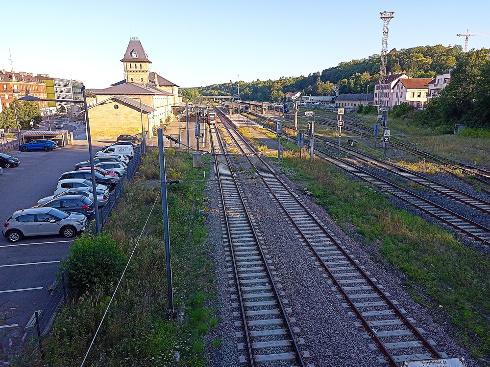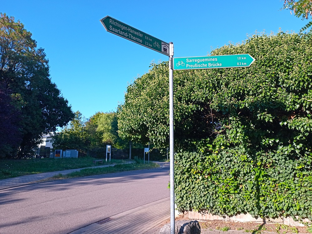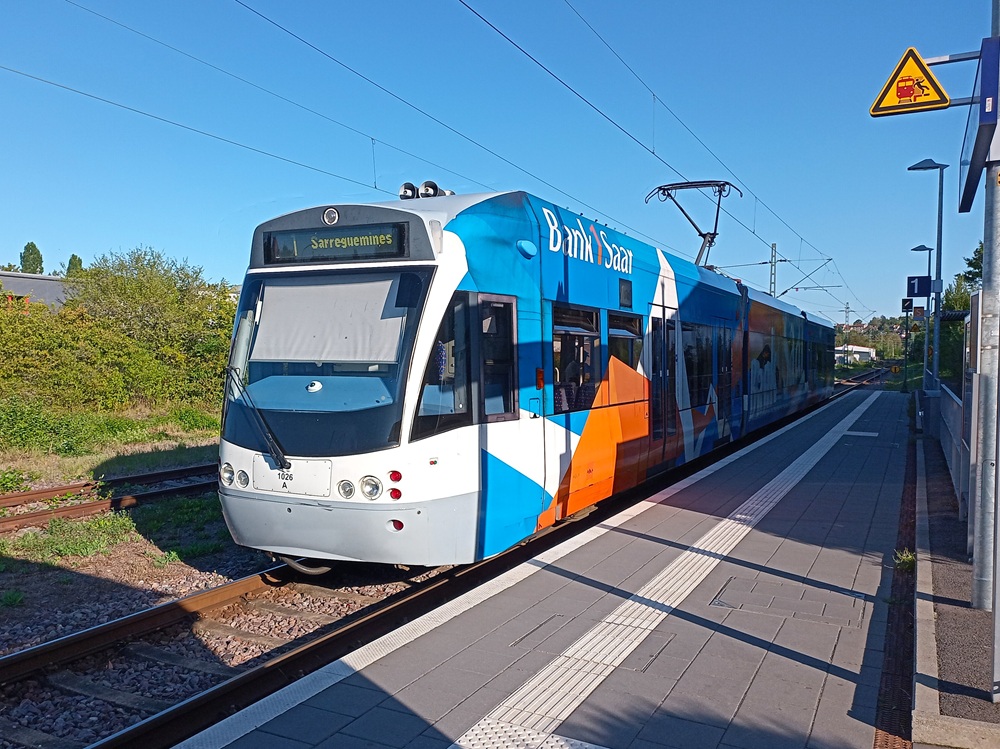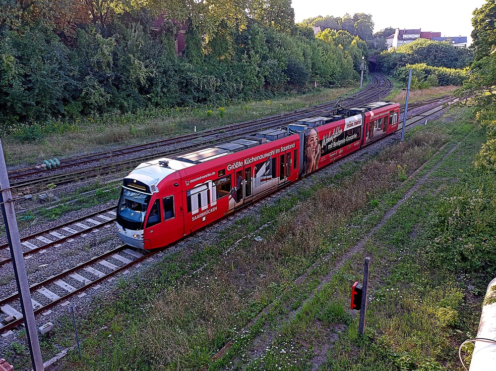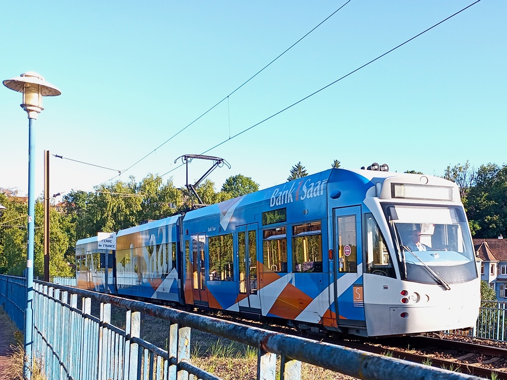 Dort nutzen wir den nächsten Zug in Richtung des südlichen Linienendpunktes Sarreguemines. Die Saarbahn quert die Innenstadt von Saarbrücken in West-Ost-Richtung und geht hinter der Haltestelle Römerkastell über in die Eisenbahnstrecke Saarbrücken – Sarreguemines. Diese Strecke, die mit den in Deutschland üblichen 15 kV Wechselstrom elektrifiziert ist, teilt sich die Straßenbahn mit Regionalzügen der Relation Saarbrücken – Strasbourg, von denen es aktuell wegen des Mangels an grenzüberschreitend einsetzbarem Fahrzeugmaterial aber nur wenige gibt. Lediglich zwei Fahrtenpaare pro Tag werden mit Diesel-Blauwalen der SNCF außerhalb der HVZ angeboten. Die neuen Régiolis-Triebwagen (Alstom Coradia Polyvalent) für den Grenzverkehr, die bald in Dienst gestellt werden sollen, werden hier mittelfristig eine Ausweitung des Verkehrsangebots ermöglichen.
